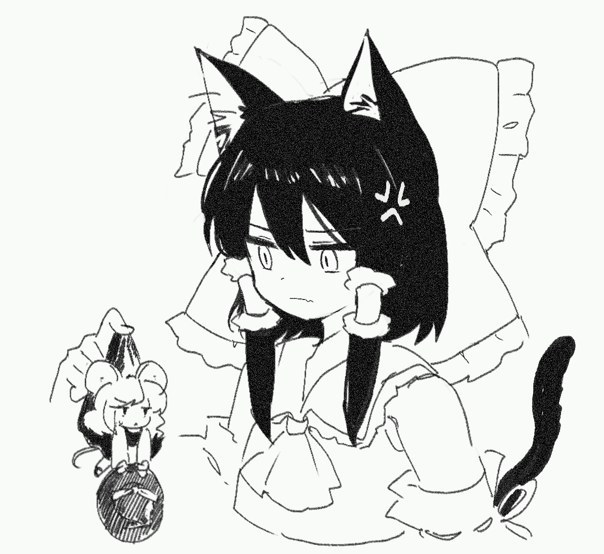2girls alternate_size anger_vein angry animal_ear_fluff animal_ears ascot bow cat_ears cat_girl cat_tail chinese_commentary closed_mouth commentary_request detached_sleeves frilled_bow frilled_hair_tubes frills hair_bow hair_tubes hakurei_reimu hat holding holding_mini_person holding_unworn_clothes holding_unworn_hat kemonomimi_mode kirisame_marisa long_hair mini_person minigirl mouse_ears mouse_girl mouse_tail multiple_girls ribbon-trimmed_sleeves ribbon_trim seiryo0425 sweatdrop tail touhou unworn_hat unworn_headwear witch_hat