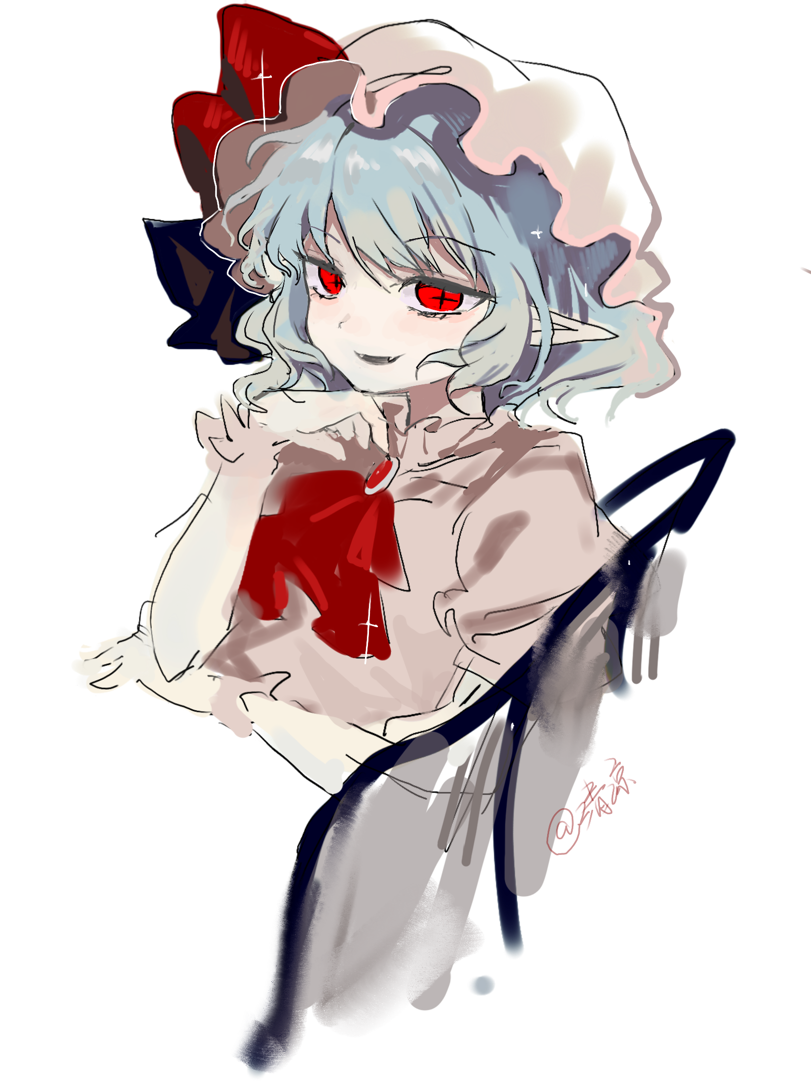 1girl ascot bat_wings blue_hair brooch chinese_commentary commentary_request fangs hair_between_eyes hat hat_ribbon highres jewelry looking_at_viewer mob_cap open_mouth pink_hat pink_shirt pointy_ears puffy_short_sleeves puffy_sleeves red_ascot red_eyes red_ribbon remilia_scarlet ribbon seiryo0425 shirt short_hair short_sleeves signature simple_background smile solo touhou white_background wings wrist_cuffs