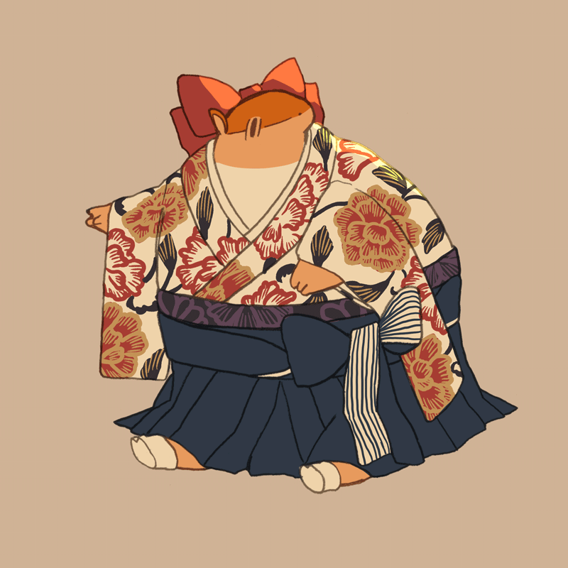 animal armadillo black_eyes brown_background clothed_animal commentary_request floral_print floral_print_kimono full_body hakama japanese_clothes john_(kyuuketsuki_sugu_shinu) kimono kyuuketsuki_sugu_shinu no_humans print_kimono simple_background sitting solo tnaym