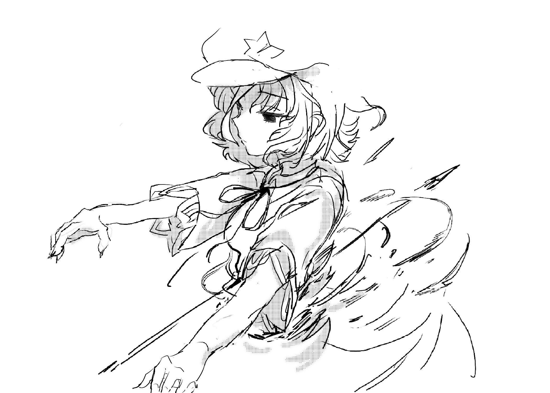 1girl chinese_commentary closed_mouth commentary_request greyscale hat hat_ornament highres medium_hair miyako_yoshika monochrome neck_ribbon outstretched_arms ribbon seiryo0425 shirt short_sleeves sketch skirt solo star_(symbol) star_hat_ornament touhou