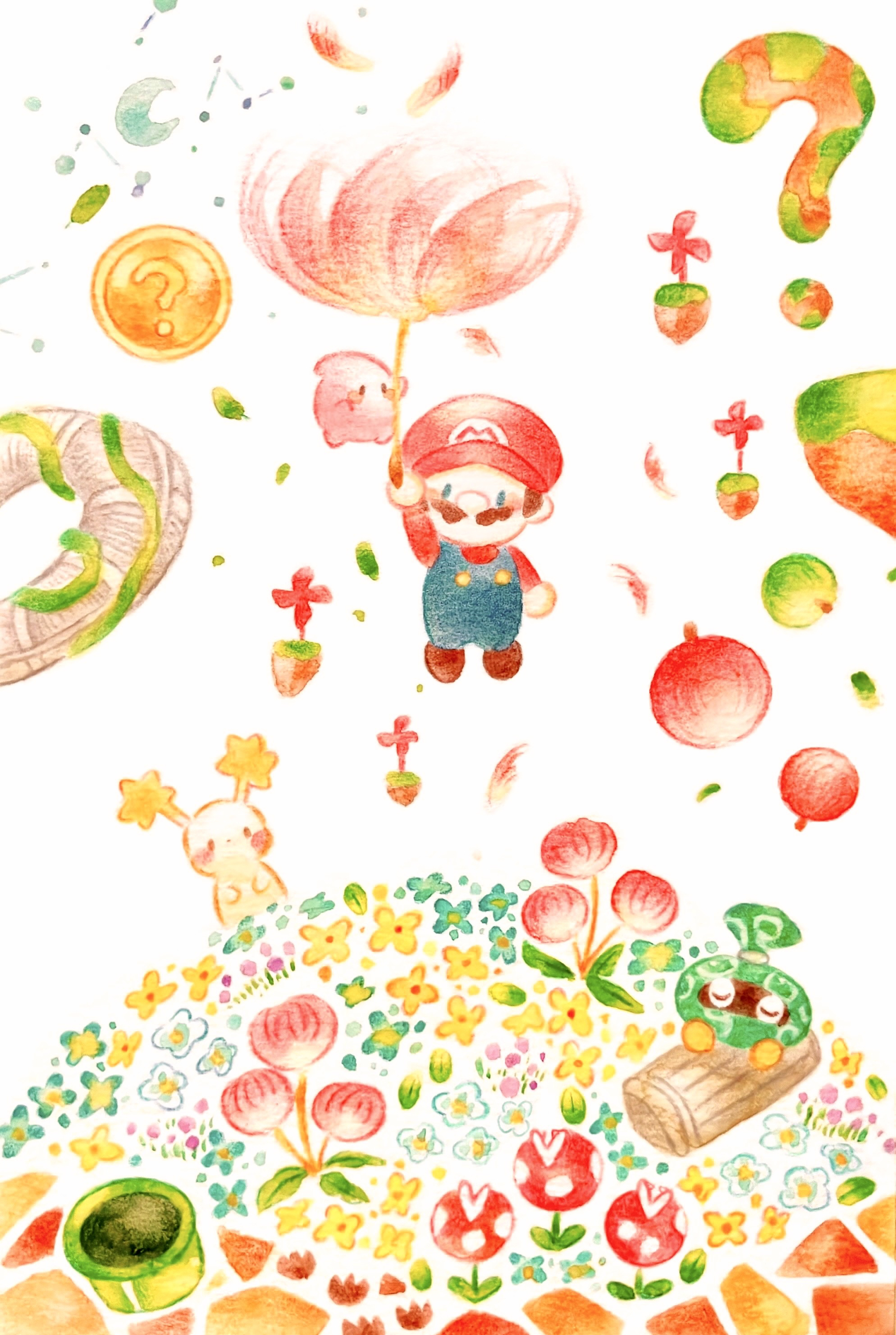 ? absurdres blue_overalls coin colored_pencil_(medium) commentary_request facial_hair hat highres leaf luma_(mario) male_focus mario mario_(series) mustache nintendo overalls painting_(medium) piranha_plant red_hat red_shirt shirt star_bunny super_mario_galaxy tracks_(mario) traditional_media warp_pipe watercolor_(medium) white_background yukichi_0611