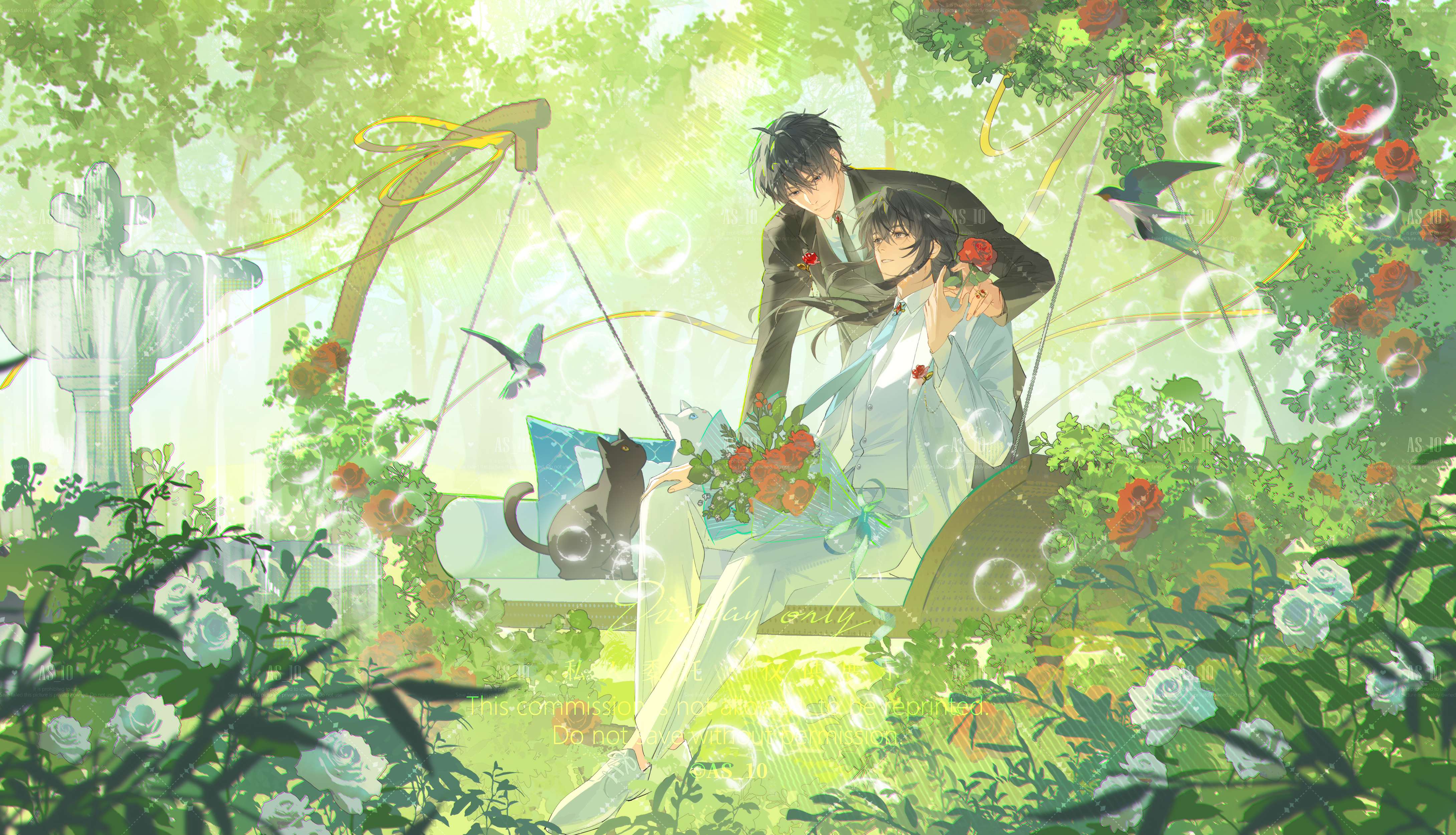 2boys absurdres as_10 black_eyes black_hair bubble collared_shirt commission day flower fountain highres jacket long_hair long_sleeves looking_at_another male_focus mihuashi_commission multiple_boys necktie on_swing original outdoors pants red_flower red_rose ribbon rose shirt short_hair sitting sunlight swing water watermark white_flower white_jacket white_rose yaoi yellow_ribbon
