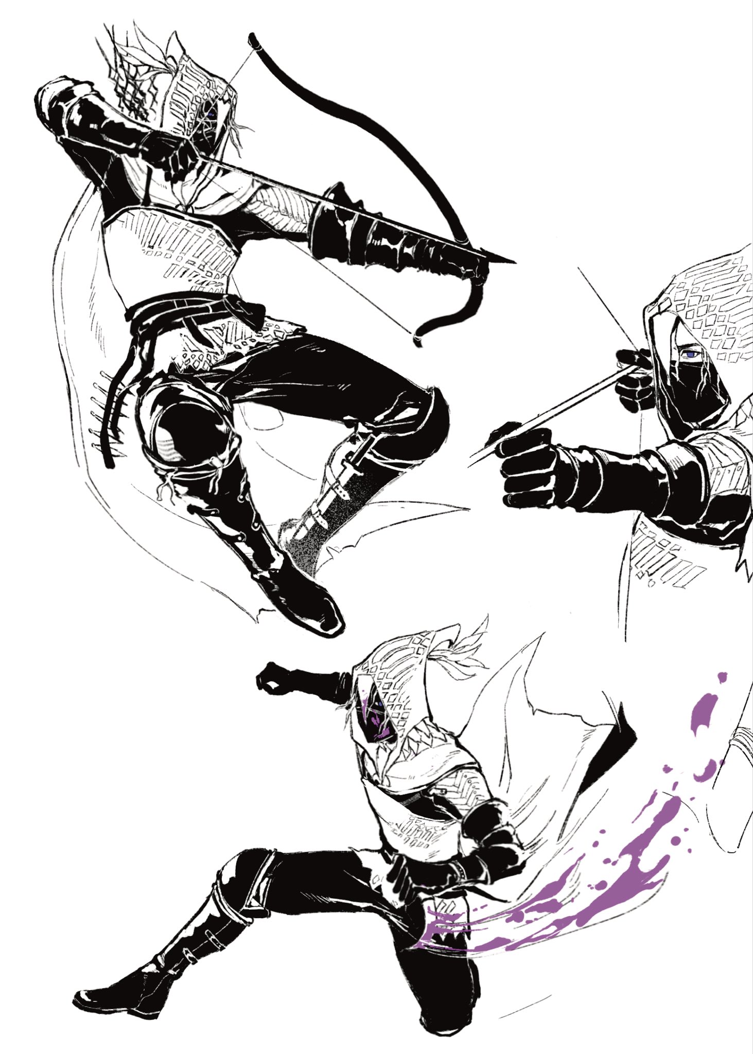1boy aiming aiming_at_viewer armor blood blood_splatter bloody_weapon boots bow_(weapon) elden_ring elden_ring_nightreign green_hood highres incoming_attack ironeye_(elden_ring) knife laozjiujiaolaoz monochrome multiple_views partially_colored quiver scale_armor spot_color weapon