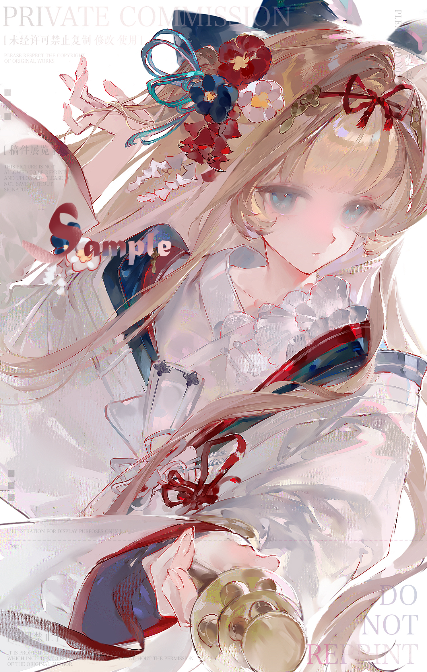 1girl black_flower blonde_hair blue_eyes blunt_bangs closed_mouth commission expressionless fingernails flower hair_flower hair_intakes hair_ornament highres holding japanese_clothes kimono long_hair long_sleeves looking_at_viewer mihuashi_commission original perdrekisuru red_flower sample_watermark sidelocks solo upper_body watermark white_flower white_kimono wide_sleeves