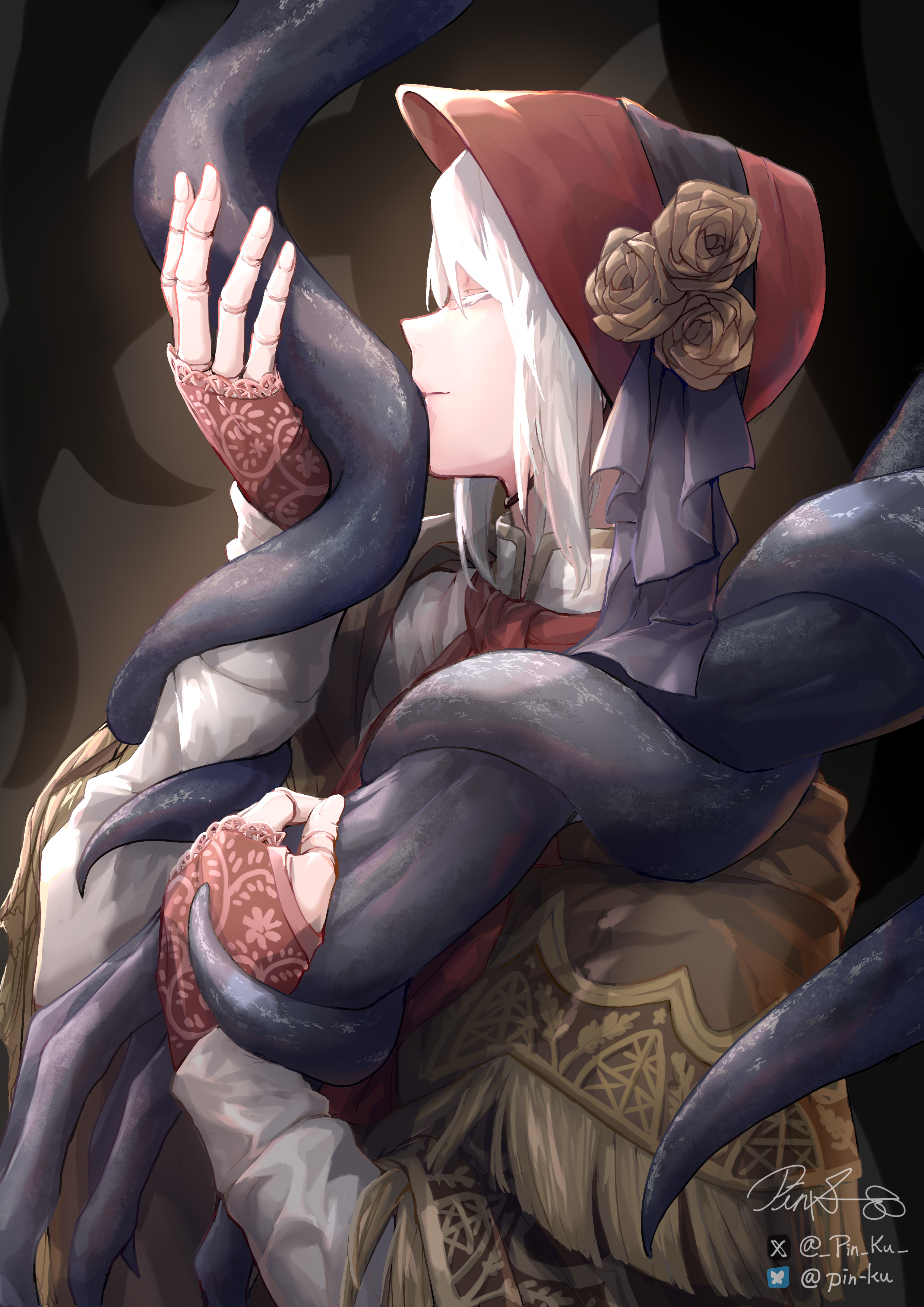 1girl 1other absurdres ascot black_hat bloodborne bonnet cloak closed_eyes coat doll_joints fingerless_gloves gloves hat hat_ornament highres hunter_(bloodborne) hunter_(great_one)_(bloodborne) joints kiss medium_hair pin.s plain_doll red_ascot red_bonnet tagme tentacles white_hair