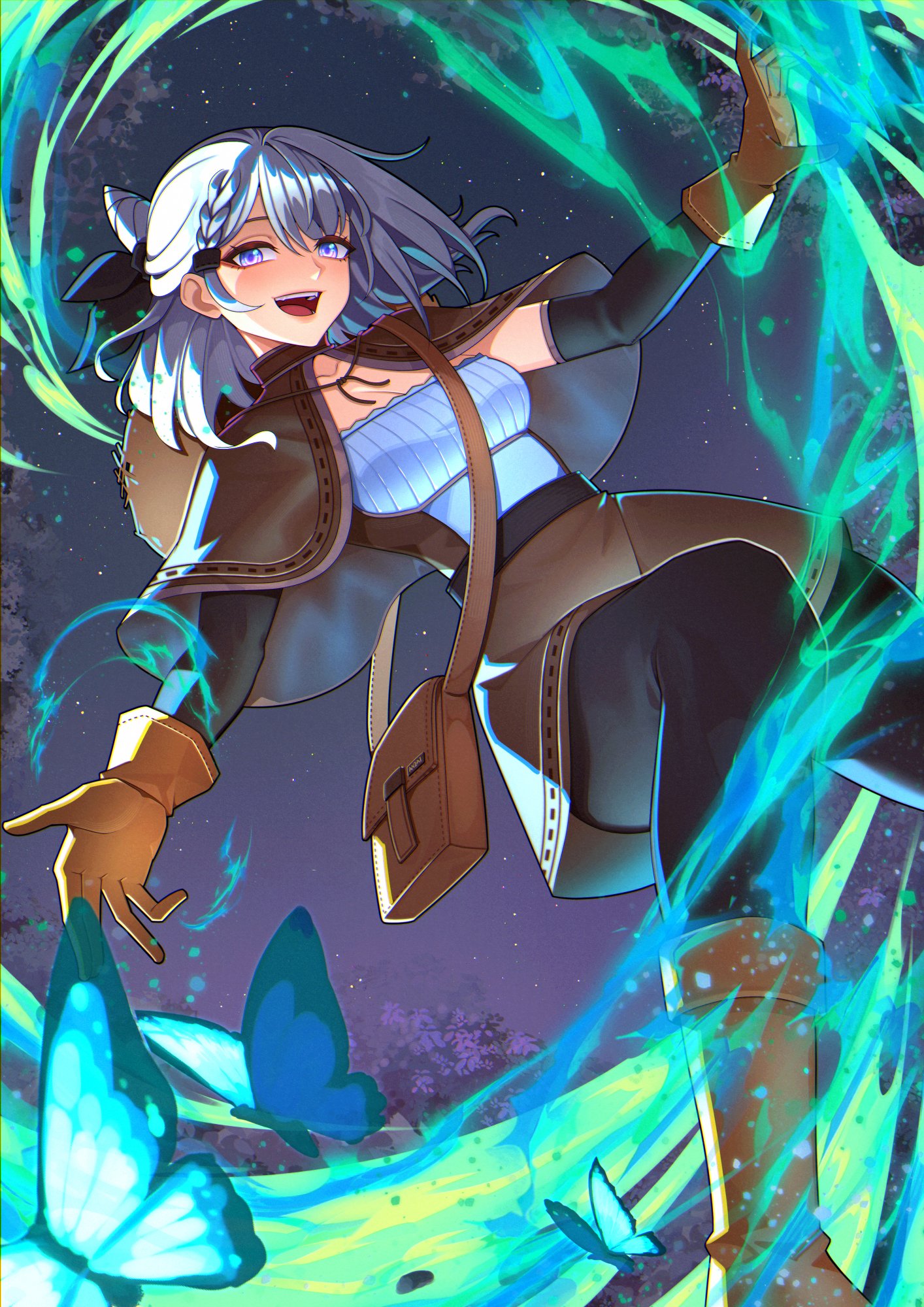 1girl alternate_costume anzailee bag black_pants boots braid breasts brown_bag brown_boots brown_capelet brown_gloves brown_skirt bug butterfly capelet cleavage commentary cone_hair_bun detached_sleeves dutch_angle english_commentary foot_out_of_frame gloves grey_hair hair_bun highres hololive hololive_indonesia insect long_hair looking_at_viewer medium_breasts open_mouth pants pants_under_skirt purple_eyes ribbed_shirt shirt shoulder_bag skirt solo standing teeth upper_teeth_only vestia_zeta virtual_youtuber