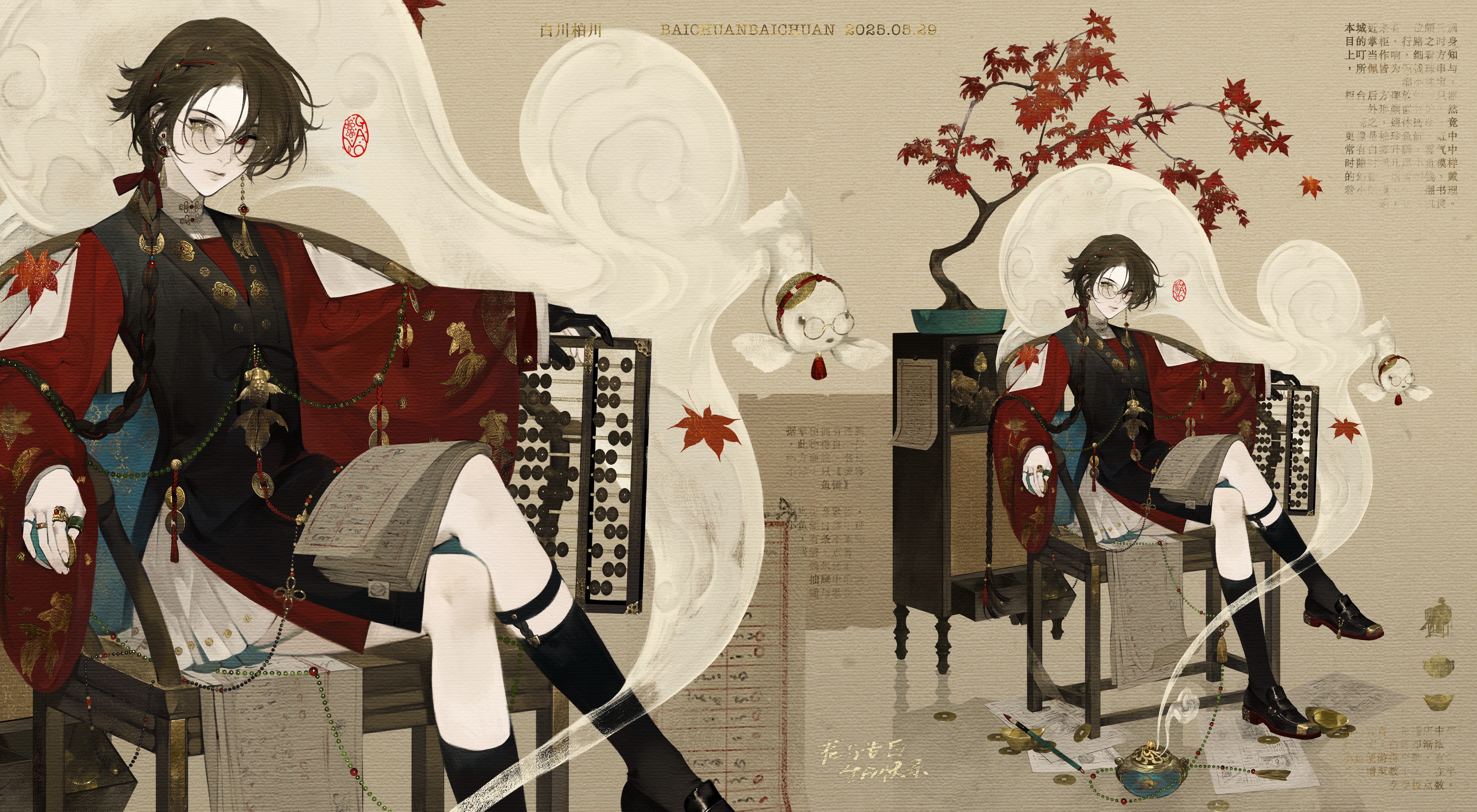 1boy abacus absurdres baichuan_baichuan black_gloves bonsai braid brown_eyes brown_hair chair chinese_clothes chinese_text closed_mouth glasses gloves highres holding_abacus jewelry leaf lips long_hair long_sleeves looking_at_viewer maple_leaf multiple_rings multiple_views on_chair original pale_skin parted_bangs ring round_eyewear single_glove sitting smoke watermark wide_sleeves