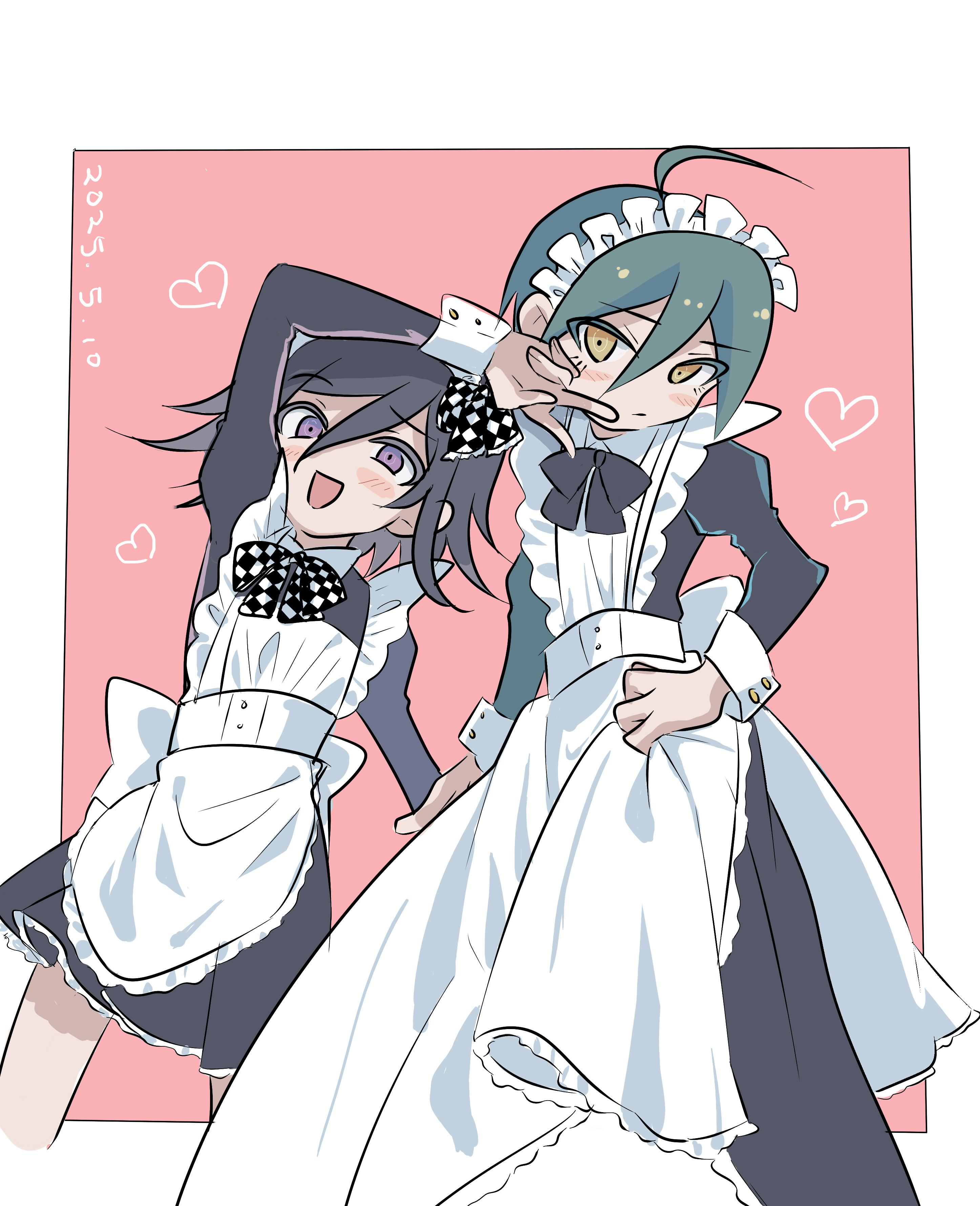 2boys absurdres ahoge alternate_costume apron bishounen black_dress black_hair blush bow bowtie bs_(twst_with) checkered_bow checkered_bowtie checkered_clothes commentary_request crossdressing crossdressing_(mtf) danganronpa_(series) danganronpa_v3:_killing_harmony dated dress embarrassed enmaided flipped_hair frilled_apron frills genderswap genderswap_(mtf) hair_between_eyes heart highres long_sleeves looking_at_viewer maid maid_apron maid_headdress male_focus male_maid multiple_boys oma_kokichi open_mouth partial_commentary pink_background puffy_sleeves saihara_shuichi short_hair simple_background smile v white_apron wrist_cuffs yellow_eyes