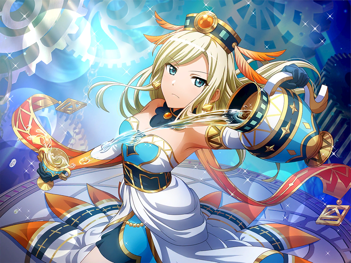 1girl aqua_eyes blonde_hair blue_gloves chalice closed_mouth cup detached_sleeves dress earrings frown game_cg gears gloves holding holding_cup holding_jar jar jewelry long_hair looking_at_viewer official_art pouring shoujo_kageki_revue_starlight shoujo_kageki_revue_starlight_-re_live- solo strapless strapless_dress tarot temperance_(tarot) upper_body water white_dress yumeoji_fumi