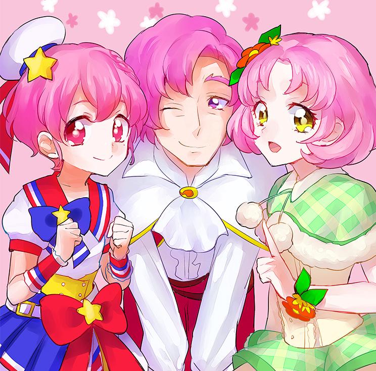 10s 1girl 2boys aikatsu! aikatsu!_(series) color_connection crossdressing dress eyelashes falsetto_(suite_precure) hair_ornament happy kitaoji_sakura kurochiroko reona_west looking_at_viewer mole mole_under_eye multiple_boys multiple_girls pink_eyes pink_hair precure pretty_series pripara purple_eyes ribbon sketch smile suite_precure wrist_cuffs yellow_eyes