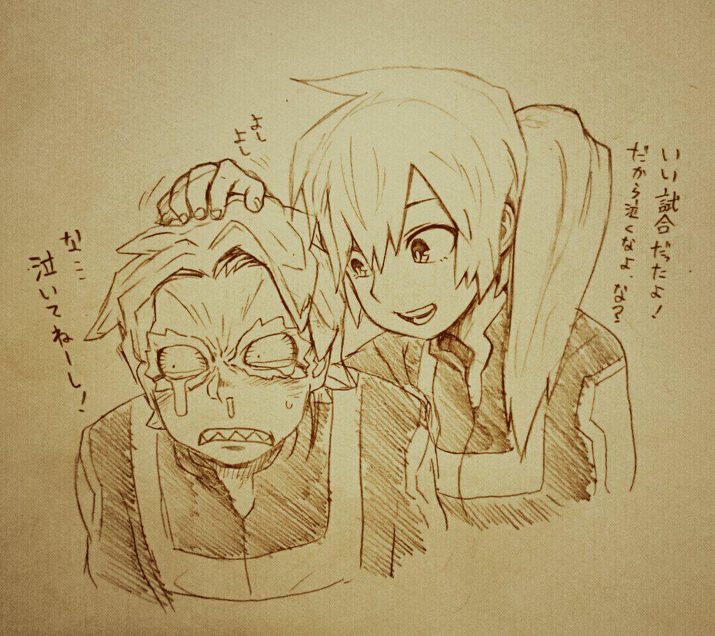 10s 1boy 1girl bloodshot_eyes boku_no_hero_academia hand_on_another's_head imai_kitoke kendou_itsuka kobushifuji long_hair looking_at_another looking_away monochrome open_mouth short_hair side_ponytail snot tears tetsutetsu_tetsutetsu translation_request upper_body