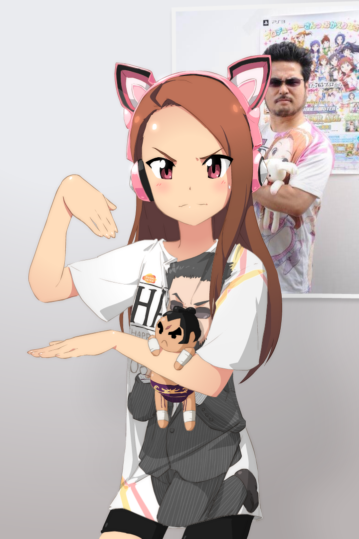 1boy 1girl animal_ear_headphones animal_ears bike_shorts black_hair blush brown_hair cat_ear_headphones cat_ears character_doll derivative_work doll facial_hair fake_animal_ears ganryu_(tekken) glasses harada_katsuhiro headphones idolmaster idolmaster_(classic) john_su kinnikuman long_hair minase_iori photo-referenced photo_(medium) photo_inset poster_(object) reference_inset reference_photo shirt stuffed_animal stuffed_rabbit stuffed_toy sweatdrop t-shirt tekken