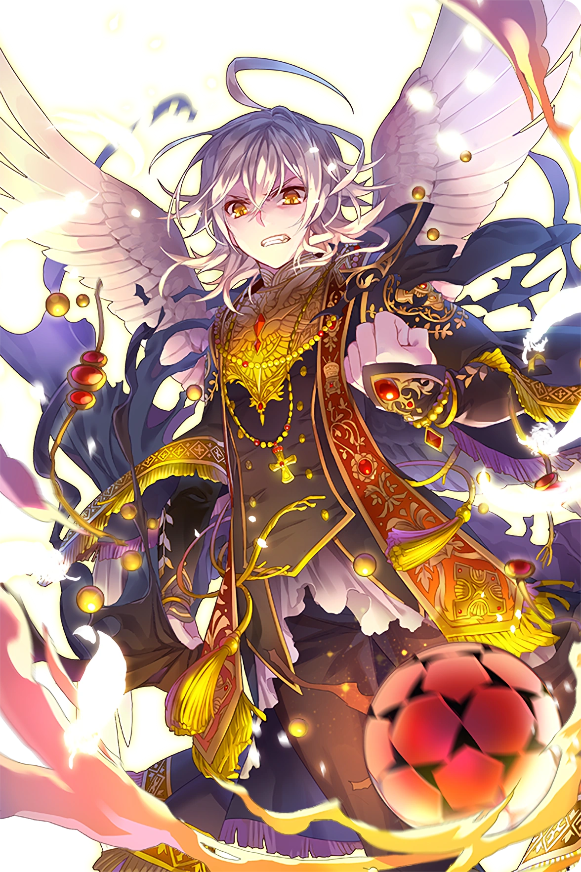 1boy angel_wings ball bracelet clenched_hand crocell_(soccer_spirits) gl_ztoh highres jewelry male_focus necklace parted_lips silver_hair soccer_ball soccer_spirits transparent_background wings yellow_eyes