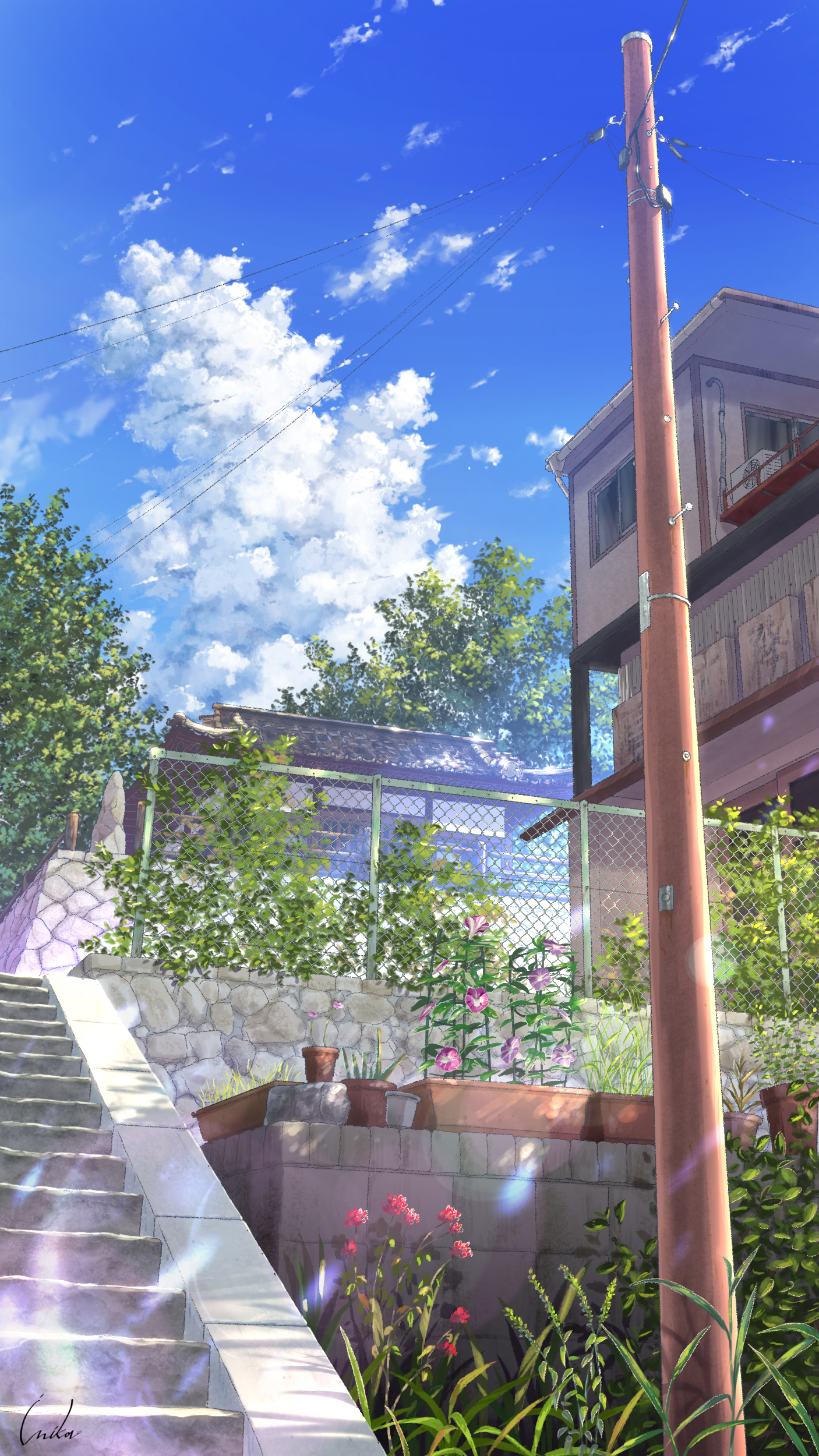 absurdres air_conditioner artist_name chain-link_fence cloud day fence flower_pot highres inika no_humans original outdoors plant potted_plant scenery signature sky stairs tree utility_pole
