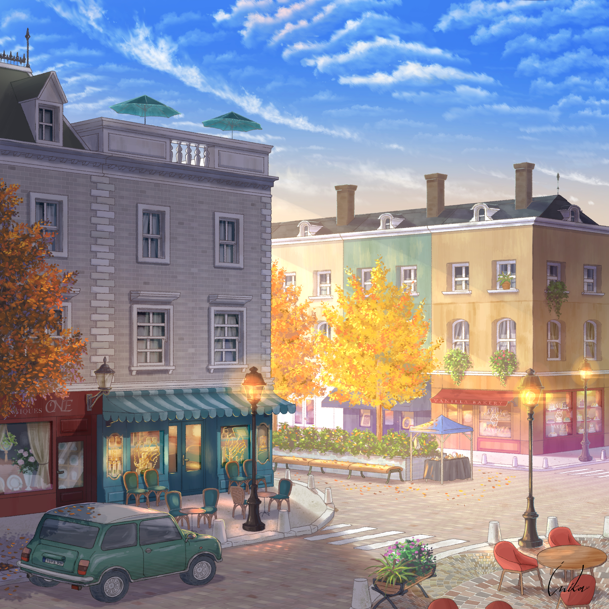 absurdres artist_name bench blue_sky building car chair chimney cloud cloudy_sky commentary_request crosswalk curtains day door flower highres inika lamppost leaf motor_vehicle no_humans original outdoors park_bench pavement plate railing road scenery shade shop sidewalk signature sky street sunlight table tree umbrella vase window