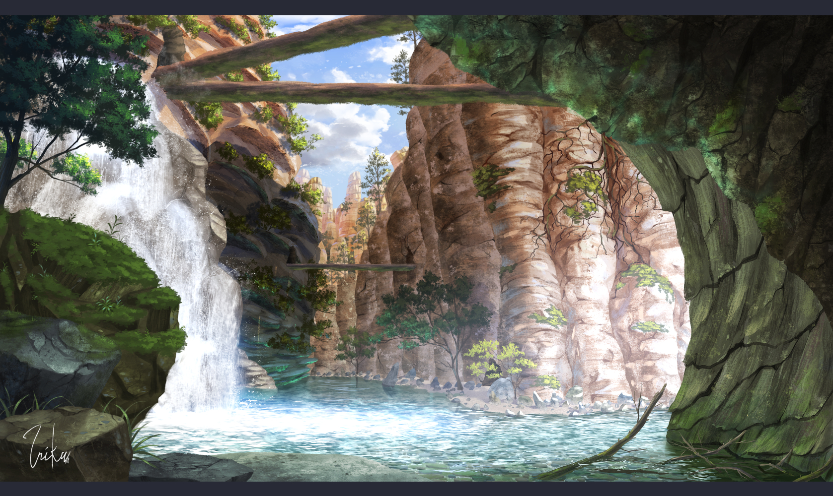 blue_sky cliff cloud commentary_request day grass highres inika landscape letterboxed log no_humans original outdoors river rock scenery signature sky sunlight tree twig water waterfall