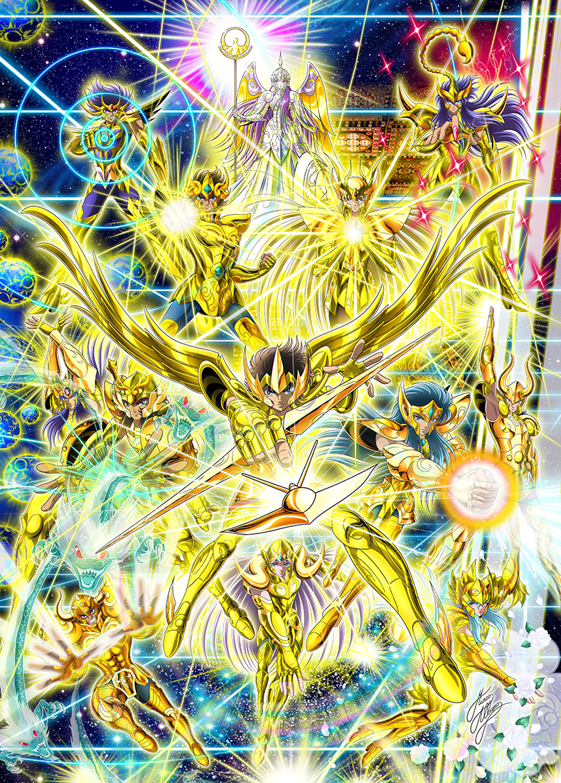 1girl 6+boys aquarius_camus aries_muu arm_up armor arrow_(projectile) athena_(saint_seiya) aura blonde_hair blue_hair bow_(weapon) brown_hair cancer_death_mask capricorn_shura dragon fighting_stance fingernails flower full_armor full_body gemini_saga glowing_armor glowing_hands gold_armor gold_aura gold_saint golden_wings helmet holding holding_bow_(weapon) holding_staff holding_weapon incoming_attack kido_saori leo_aiolia libra_douko long_hair looking_at_viewer marco_albiero metal_wings multiple_boys pisces_aphrodite planet purple_hair rose sagittarius_aioros saint_seiya scorpio_milo sharp_fingernails signature sky sparkle staff standing star_(sky) starry_sky taurus_aldebaran very_long_hair virgo_shaka weapon white_flower white_rose