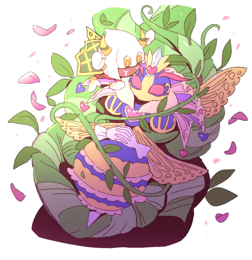 1boy 1girl antennae arthropod_girl bad_id bad_twitter_id bug cape closed_eyes death dede_(qwea_00000) dreamstalk extra_hands eyelashes gloves heart horns insect_wings jewelry kirby:_triple_deluxe kirby_(series) kiss leaf nintendo own_hands_together petals plant queen_sectonia rayman_limbs single_tear taranza vines white_background white_hair wings