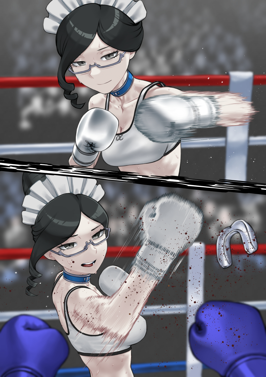 1girl black_hair blood blood_splatter boxing boxing_gloves boxing_ring choker glasses gloves hair_bun highres jab looking_at_viewer maid maid_headdress mouth_guard overlord_(maruyama) rggr sports_bra sweat uppercut yuri_alpha