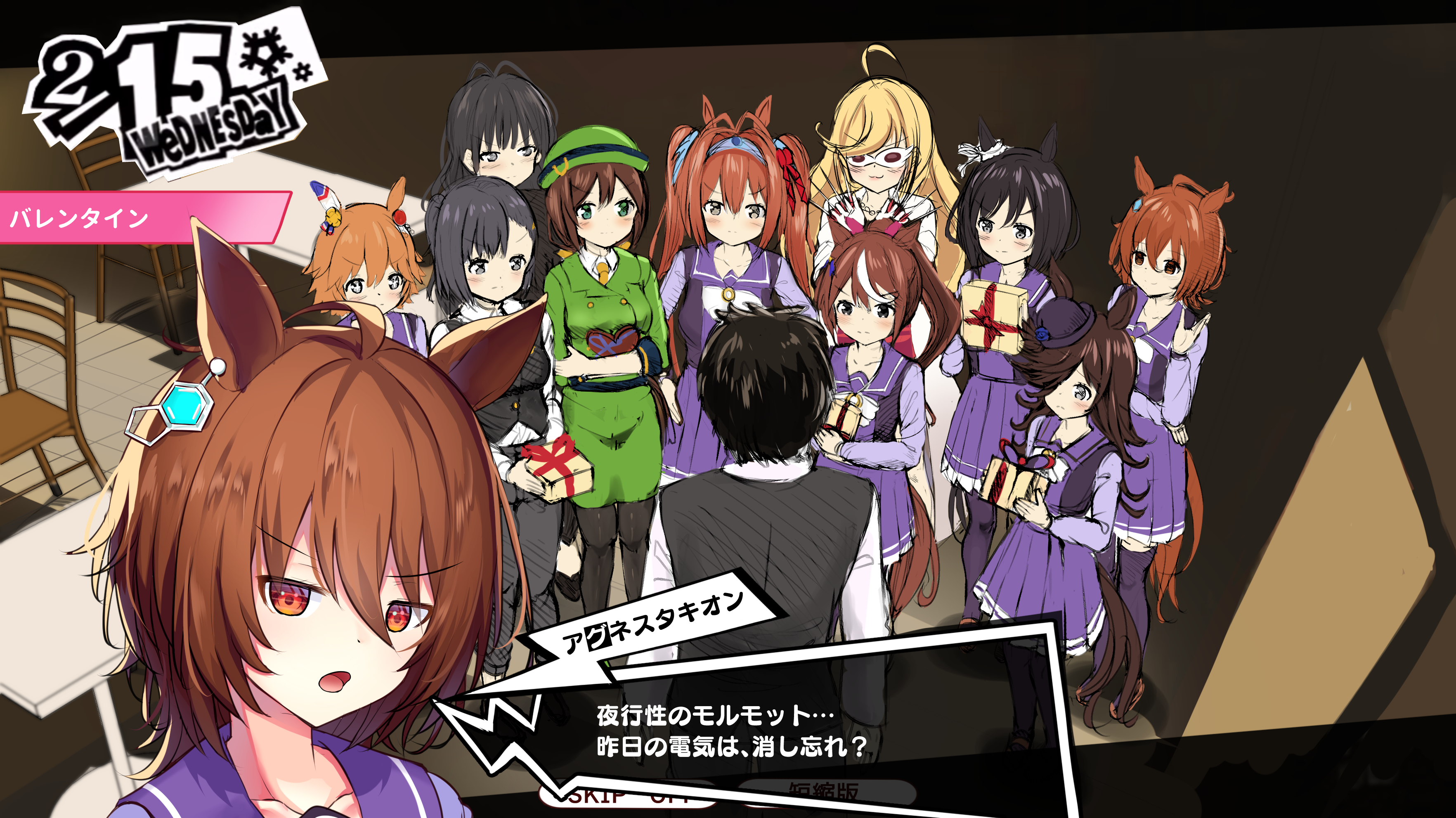 1boy 6+girls absurdres agnes_tachyon_(umamusume) ahoge amamiya_ren animal_ears anshinzawa_sasami antenna_hair black_hair black_pants blue_flower blue_headwear blue_rose bow bowler_hat bowtie brown_eyes brown_hair commentary crossover daiwa_scarlet_(umamusume) dialogue_box ear_ornament earrings eishin_flash_(umamusume) empty_eyes flower green_eyes grey_eyes hair_between_eyes hair_bow hair_over_one_eye hat hat_flower hayakawa_tazuna high_ponytail highres horse_ears horse_girl horse_tail jewelry kashimoto_riko kiryuuin_aoi long_hair long_sleeves matikanefukukitaru_(umamusume) multiple_girls necktie orange_hair pants pants_rolled_up parody persona persona_5 pleated_skirt ponytail purple_sailor_collar purple_shirt purple_skirt rice_shower_(umamusume) rose sailor_collar sailor_shirt scene_reference school_uniform shirt short_hair single_earring skirt snowflakes swept_bangs tail tilted_headwear tokai_teio_(umamusume) tracen_school_uniform trainer_(umamusume) trait_connection translated twintails umamusume valentine vest white_bow white_bowtie white_hair winter_uniform yellow_necktie yuutopia