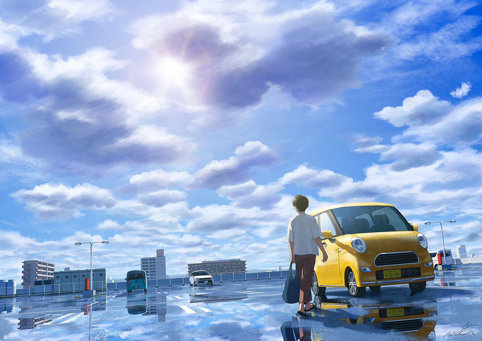 1boy after_rain bag brown_hair brown_pants building car cloud cloudy_sky highres holding holding_bag male_focus motor_vehicle original pants papi_(papiron100) parking_lot reflection reflective_floor sandals scenery shirt shopping_bag short_hair sky solo wet wet_ground white_shirt yellow_car