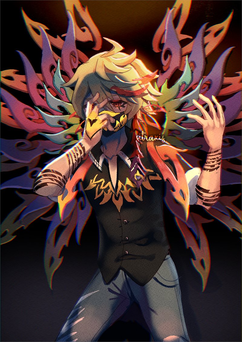 1boy ahoge bird black_shirt blonde_hair blue_jeans brown_eyes buttons collared_shirt face_mask kanade_rindo male_focus mask mouth_mask phoenix phoenix_wings shin_subarashiki_kono_sekai shirt short_sleeves solo solo_focus subarashiki_kono_sekai tattoo