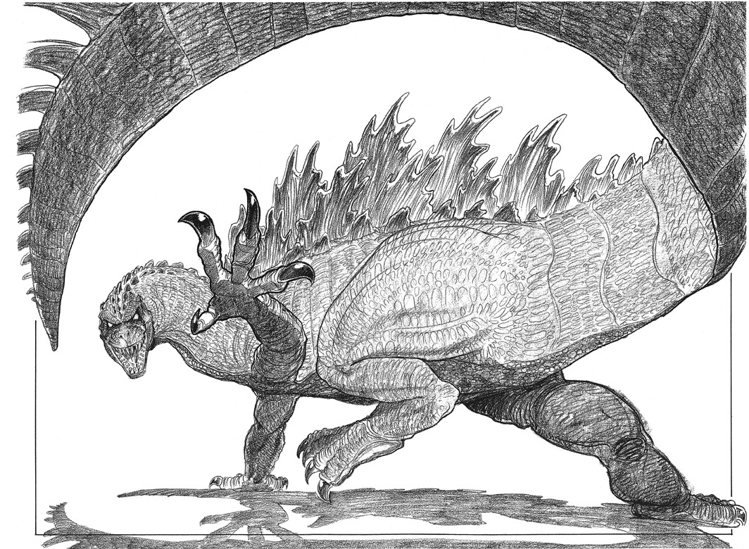 all_fours concept_art cut_content dinosaur giant giant_monster godzilla godzilla_(series) godzilla_(unmade_1994_u.s._film) kaiju monster no_humans official_art ricardo_delgado sketch spikes squatting tail toho tristar_pictures