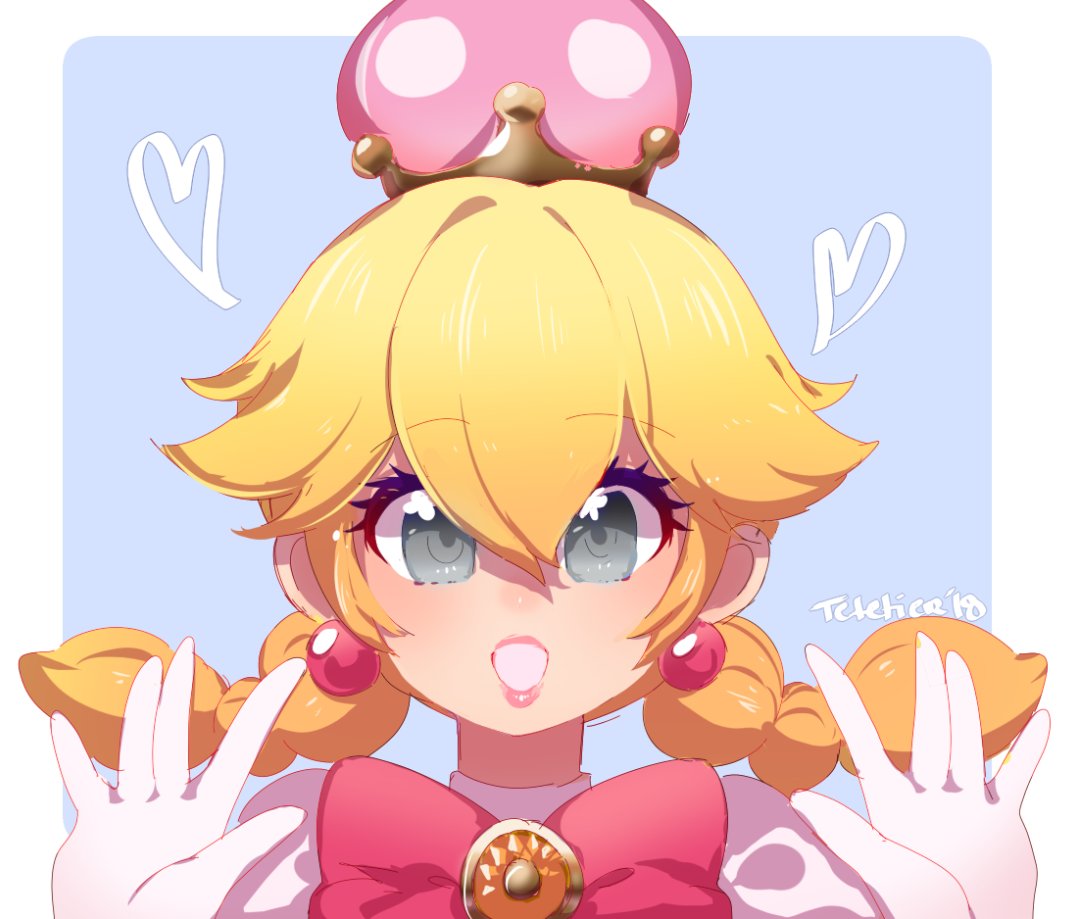 1girl artist_name blonde_hair blue_background border bow braid brooch crown earrings eyelashes gloves grey_eyes hands_up heart jewelry lips looking_at_viewer mario_(series) new_super_mario_bros._u_deluxe nintendo no_nose open_hands open_mouth peachette pink_bow pink_lips puffy_sleeves shirt simple_background solo super_crown tetetier toadette twin_braids twintails upper_body white_border white_gloves white_shirt