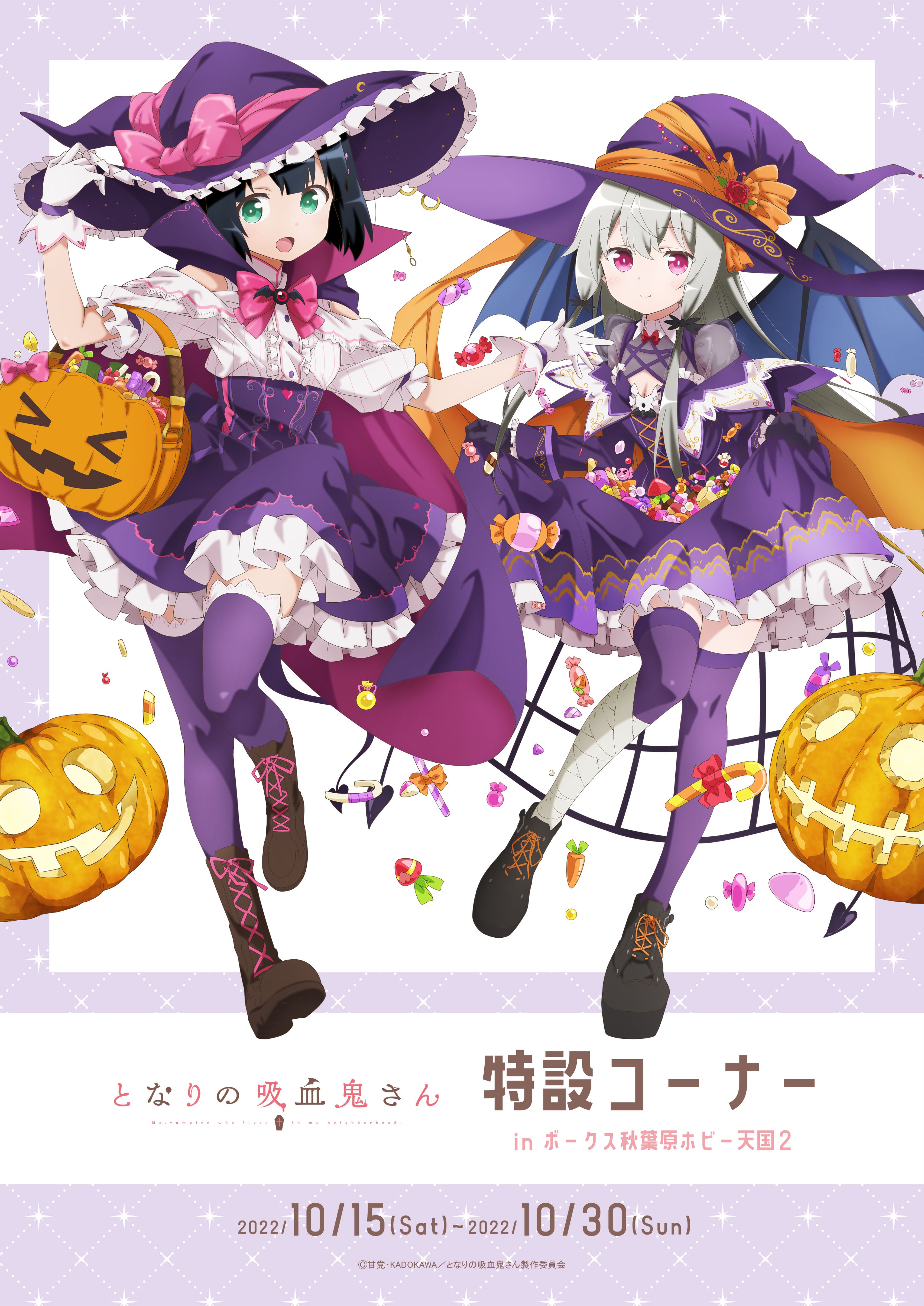 absurdres amano_akari bad_link bat_wings black_hair candy food grey_hair halloween halloween_costume hat highres jack-o'-lantern long_hair official_art pumpkin sophie_twilight tonari_no_kyuuketsuki-san trick_or_treat very_long_hair wings witch