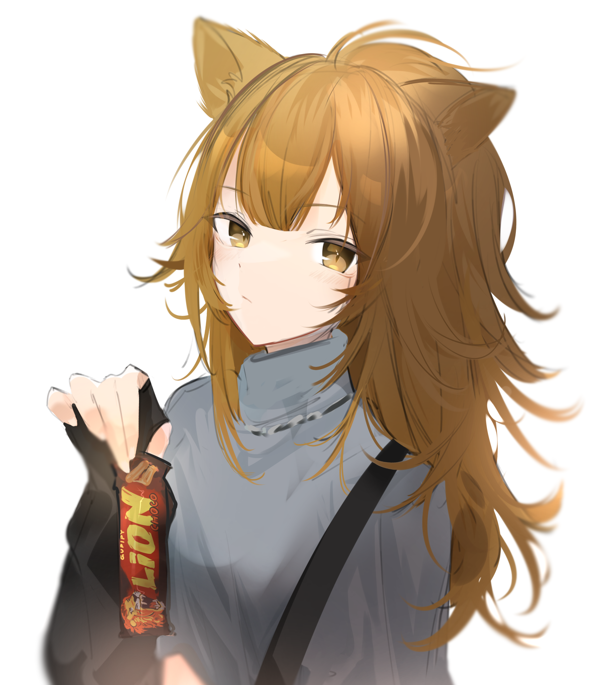 1girl absurdres animal_ears arknights black_gloves breasts brown_eyes brown_hair candy chocolate chocolate_bar fingerless_gloves food gloves grey_shirt gupipy hand_up highres holding holding_food lion_ears looking_at_viewer shirt siege_(arknights) simple_background small_breasts solo upper_body white_background