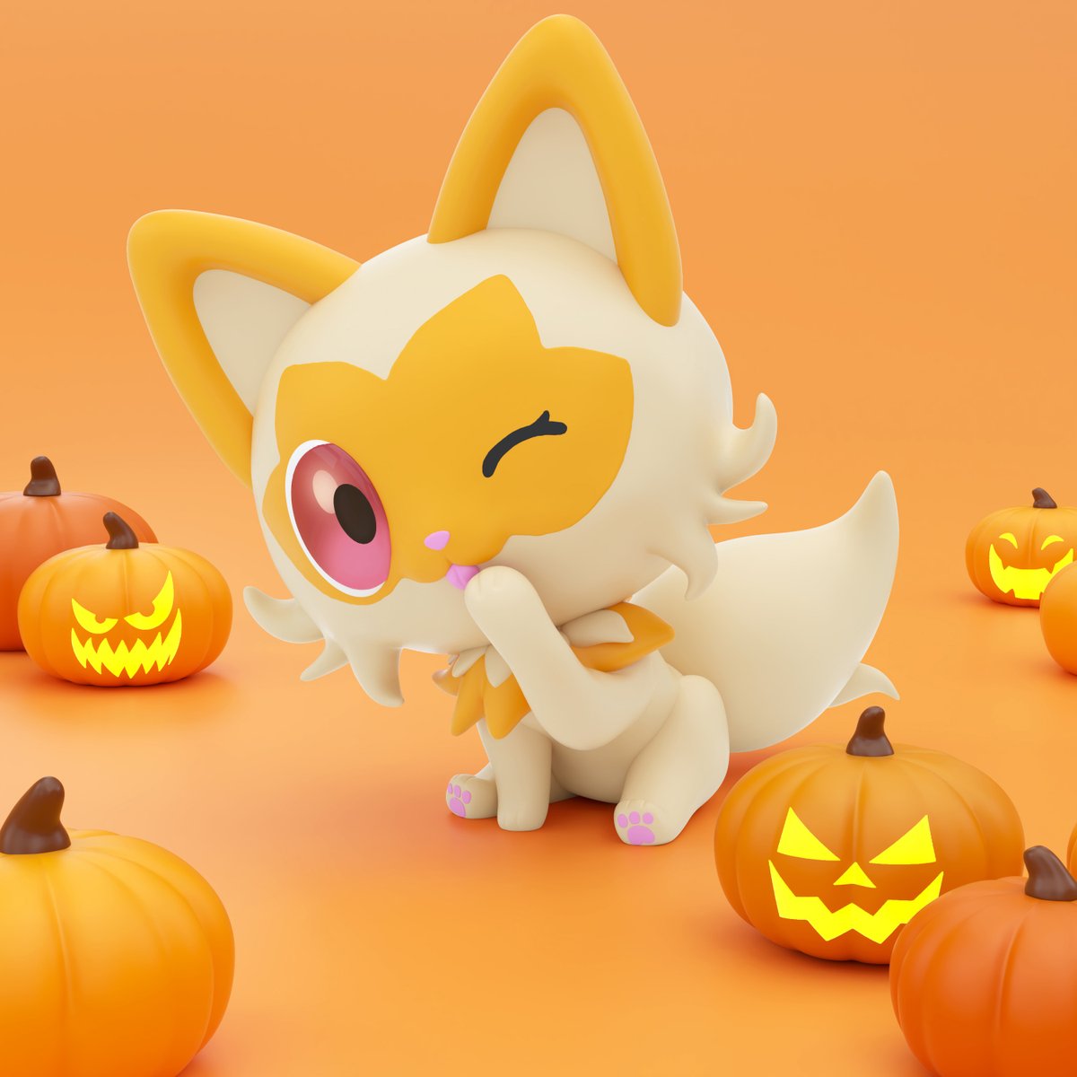 3d alternate_color animal_focus commentary english_commentary full_body halloween highres jack-o'-lantern licking licking_hand looking_at_viewer nintendo no_humans one_eye_closed orange_background orange_theme pawpads pink_eyes pokemon pokemon_(creature) puffcakerosie pumpkin simple_background sitting solo sprigatito tongue tongue_out zbrush_(medium)