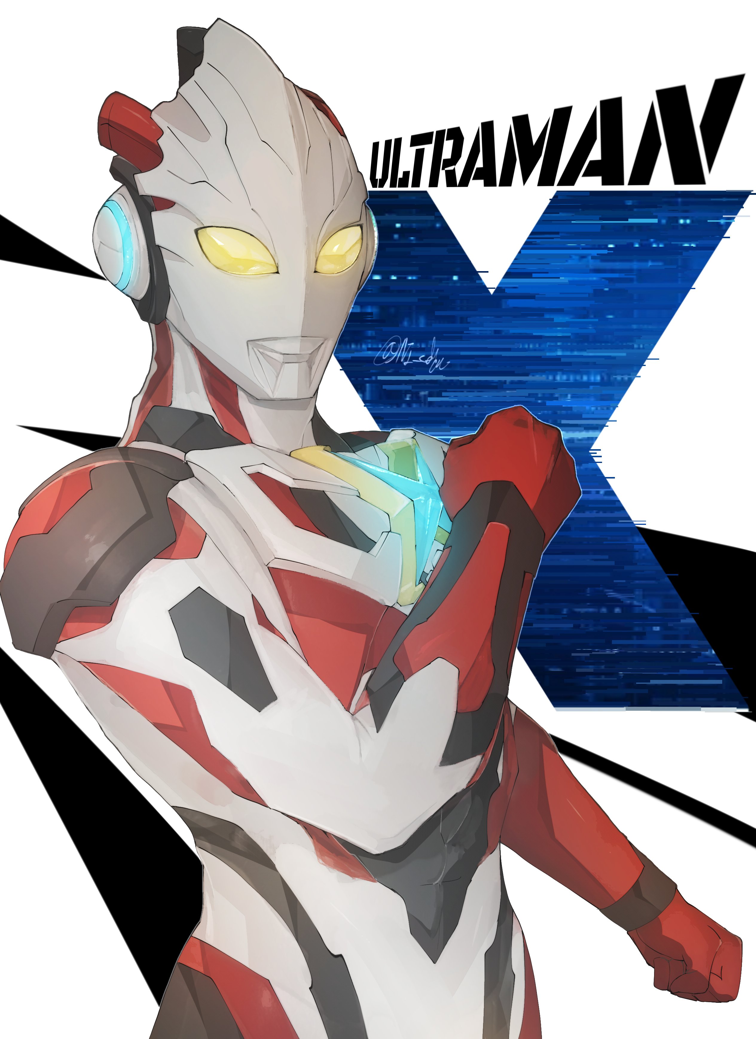 1boy absurdres alien armor bodysuit breastplate character_name clenched_hands commentary_request glowing highres looking_at_viewer male_focus multicolored_bodysuit ni_celery_pk red_armor red_bodysuit signature twitter_username two-tone_bodysuit ultra_series ultraman_x ultraman_x_(series) vambraces white_bodysuit yellow_eyes