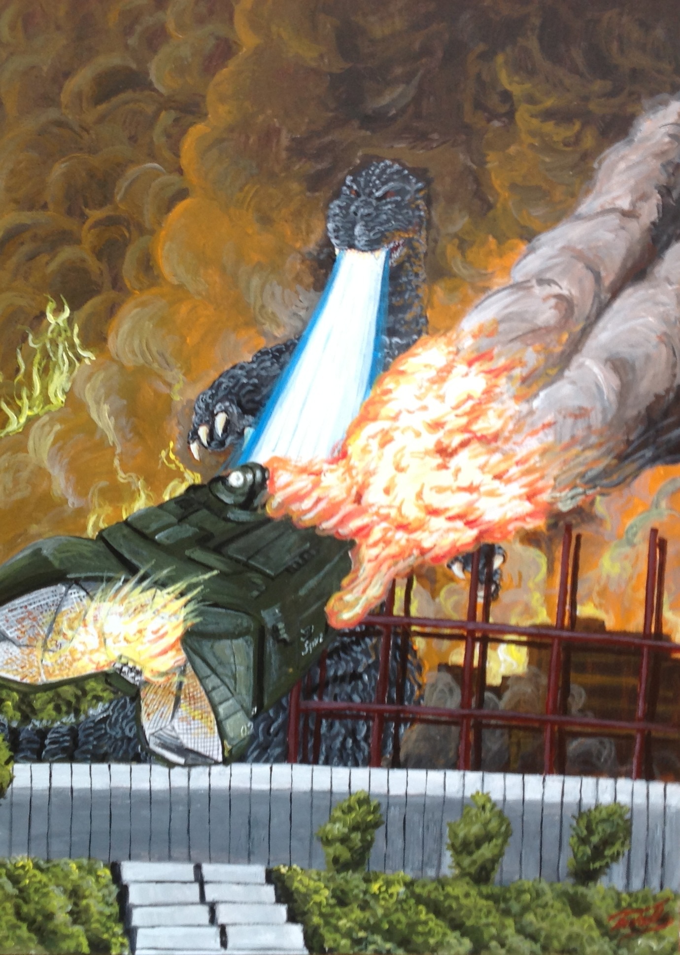 atomic_breath breath_weapon bush construction_site destruction dinosaur drone energy energy_beam explosion fire fire-mirror flying flying_submarine godzilla godzilla_(series) godzilla_vs._biollante grass highres japan_self-defense_force kaiju military mouth_beam night no_humans osaka_(city) plant red_eyes smoke stairs submarine super_x2 thermacabe toho unmanned_aerial_vehicle unmanned_underwater_vehicle watercraft
