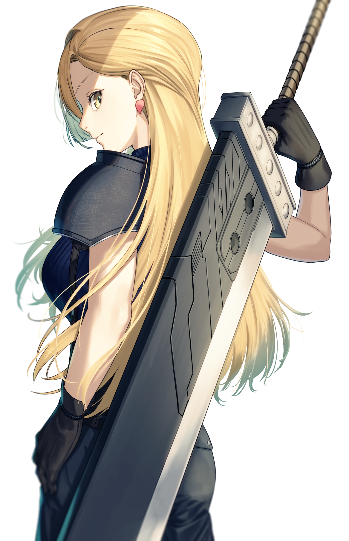 1girl armor black_gloves black_pants blonde_hair blue_sweater closed_mouth cosplay crisis_core:_final_fantasy_vii earrings final_fantasy final_fantasy_vii from_behind gloves grey_background hand_on_own_hip highres holding holding_sword holding_weapon jewelry long_hair looking_at_viewer looking_back matsuharu_(lip-mil) nijisanji nui_sociere pants ribbed_sweater shoulder_armor sleeveless sleeveless_sweater smile solo standing sweater sword very_long_hair virtual_youtuber weapon yellow_eyes zack_fair zack_fair_(cosplay)
