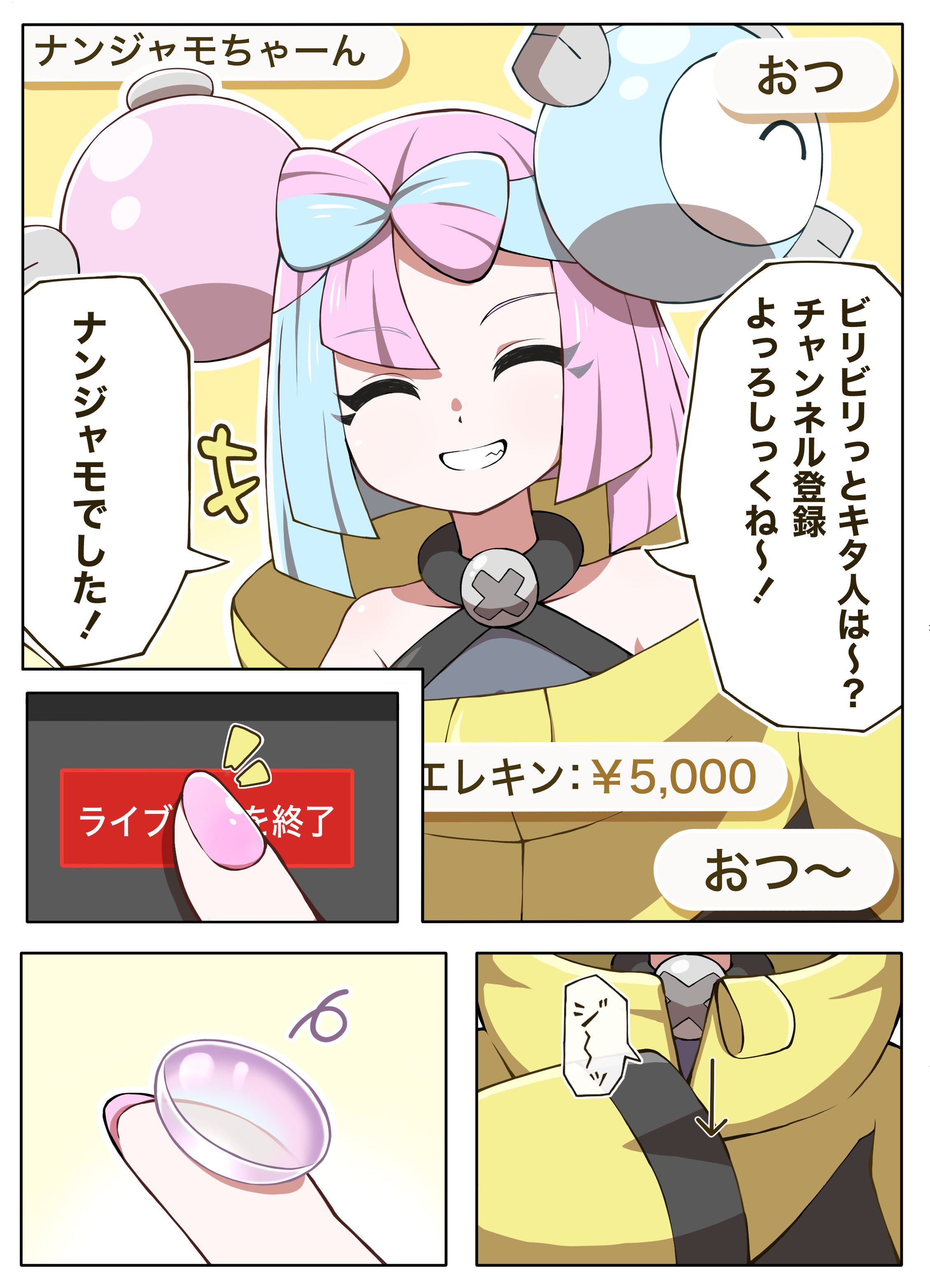 1girl absurdres arrow_(symbol) border character_hair_ornament closed_eyes comic commentary_request contact_lens eyelashes facing_viewer green_hair grey_shirt grin hair_ornament highres iono_(pokemon) jacket long_sleeves nail_polish nintendo pink_hair pink_nails pokemon pokemon_sv shabana_may shirt sleeveless sleeveless_shirt sleeves_past_fingers sleeves_past_wrists smile speech_bubble teeth translated white_border yellow_jacket