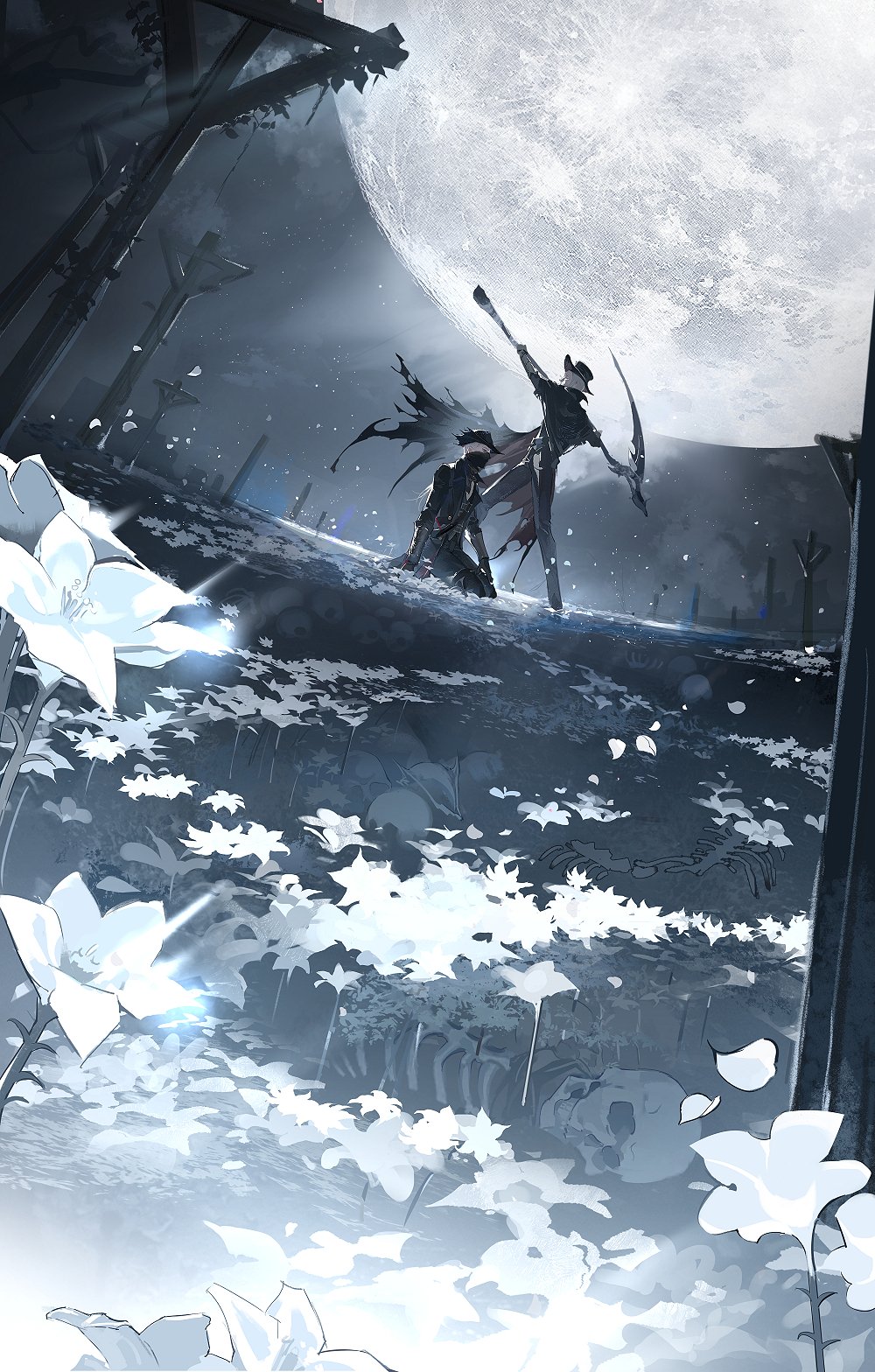 2boys black_jacket black_pants bloodborne burial_blade cape execution field flower flower_field gehrman_the_first_hunter grass hat highres hunter_(bloodborne) imminent_death jacket moon mrthersh multiple_boys night pants seiza sitting sky tricorne