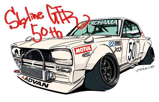 anniversary cable car commentary english_commentary motor_vehicle nissan nissan_skyline nissan_skyline_c10 nissan_skyline_gt-r no_humans original ozizo roundel signature simple_background solo sticker vehicle_focus vehicle_name white_background