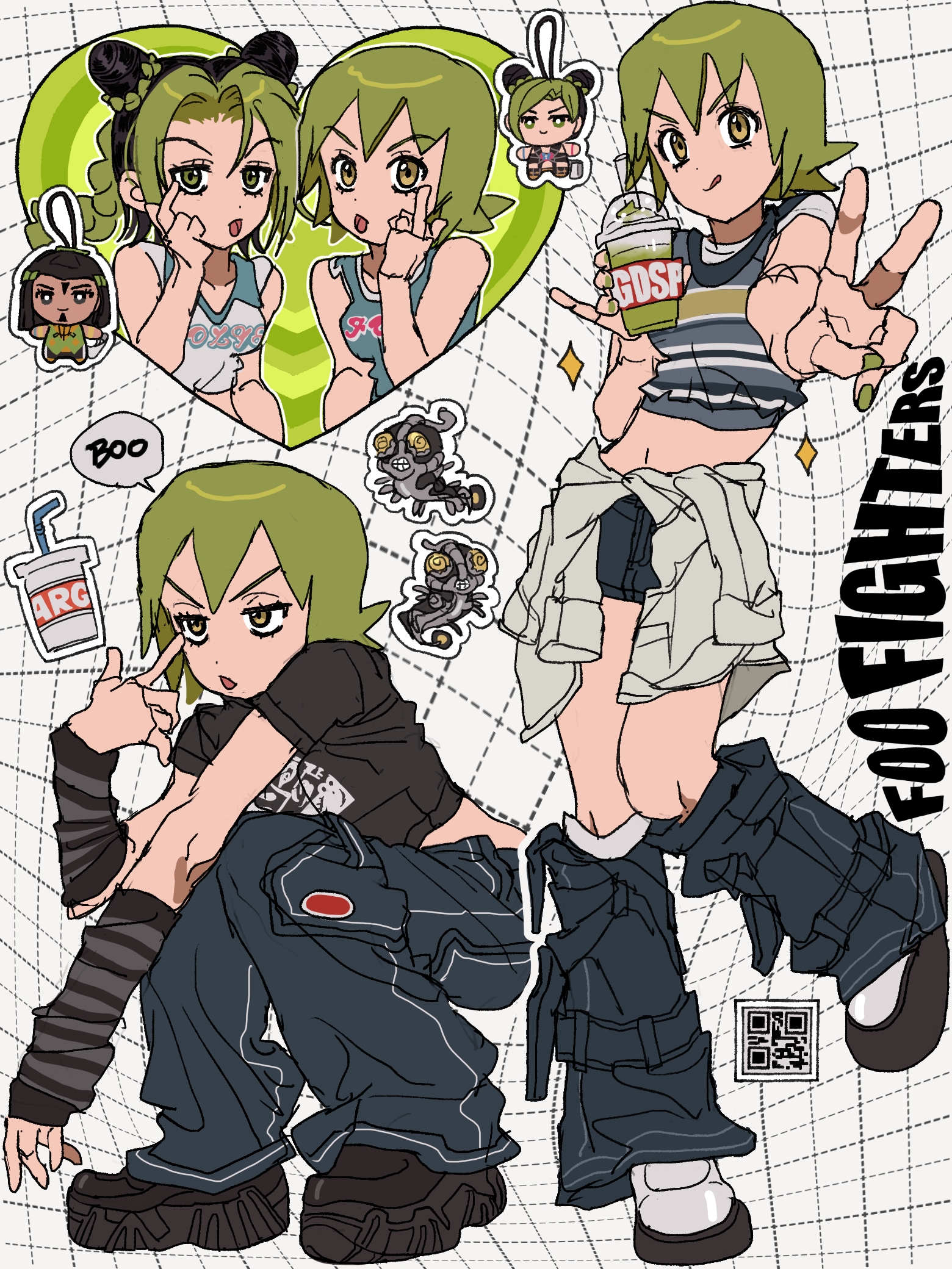 3girls akanbe arm_warmers black_hair clothes_around_waist crop_top dark-skinned_female dark_skin denim detached_sleeves double_bun dreadlocks ermes_costello eyelid_pull foo_fighters_(jojo) foo_fighters_(stand) fu_r_y green_hair green_lips hair_bun highres jacket jacket_around_waist jeans jojo_no_kimyou_na_bouken charm_(object) kuujou_jolyne loose_socks midriff multicolored_hair multiple_girls multiple_persona pants short_hair slushie socks stand_(jojo) stone_ocean tongue tongue_out two-tone_hair