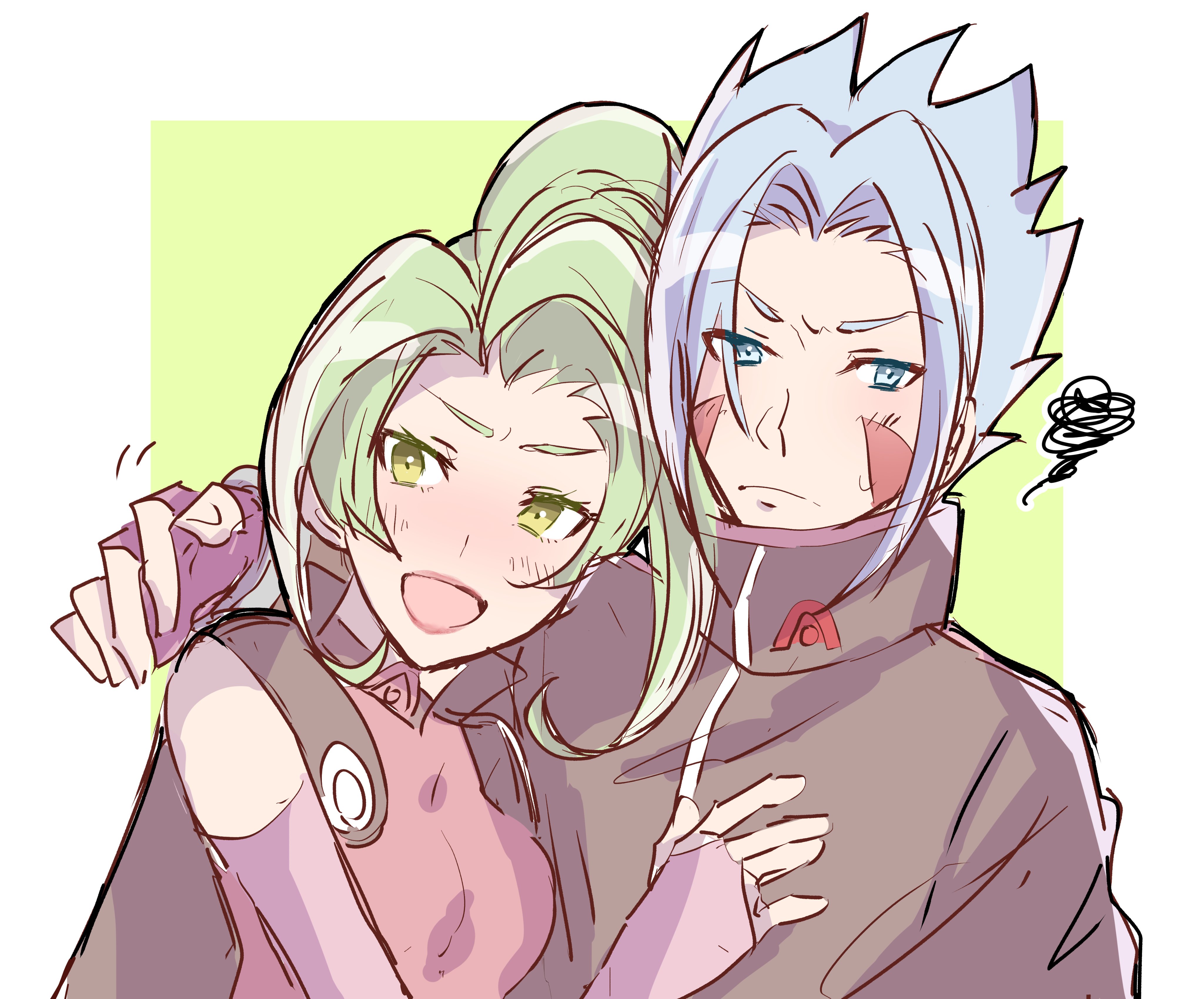 1boy 1girl absurdres blue_eyes dinosaur_king green_hair happy highres nopis smile usarapa yellow_eyes