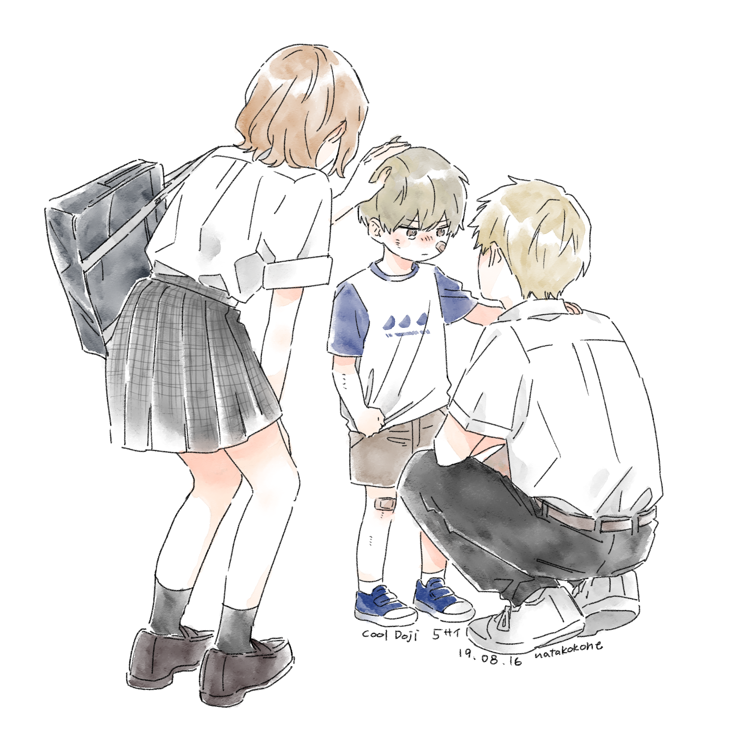 1girl 2boys absurdres aged_down artist_name bag bandaid bandaid_on_cheek bandaid_on_face bandaid_on_knee bandaid_on_leg belt black_pants black_socks blonde_hair brown_belt brown_eyes brown_hair brown_shorts child collared_shirt commentary_request cool_doji_danshi dated full_body futami_shun hand_on_another's_head headpat highres medium_hair multiple_boys nata_kokone pants school_bag school_uniform shirt short_hair short_sleeves shorts simple_background skirt socks squatting standing white_background white_shirt