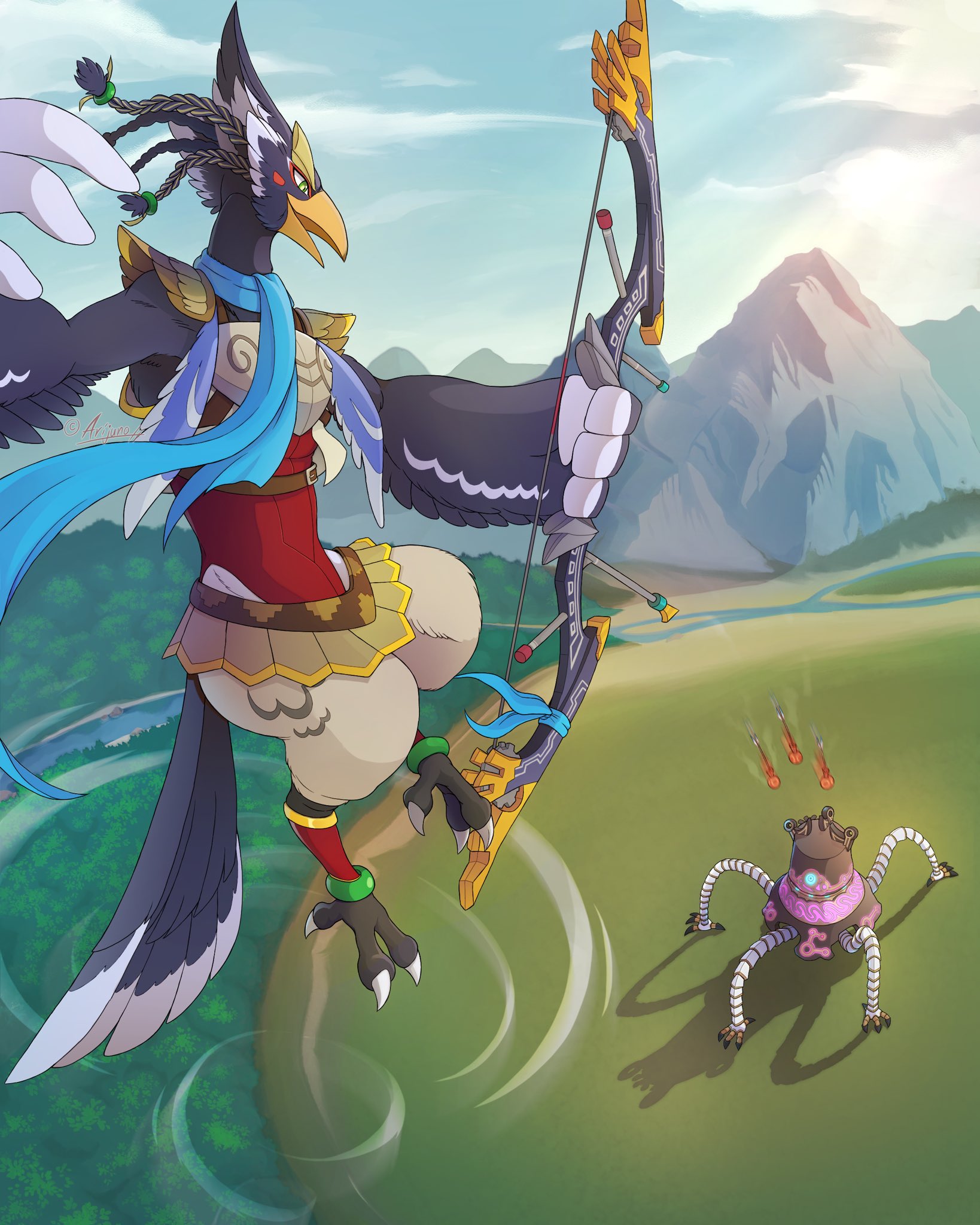 1boy animal_feet arijuno armor arms_up arrow_(projectile) artist_name battle beak bird_boy bird_legs bird_tail blue_eyes blue_fur blue_hair blue_scarf blue_sky blush_stickers body_fur bow_(weapon) braid breastplate claws cloud day eye_contact forest from_above full_body furry furry_male green_eyes guardian_(zelda) hair_tie highres holding holding_bow_(weapon) holding_weapon leg_warmers light_rays looking_at_another looking_down looking_up male_focus midair motion_blur mountain nature nintendo one-eyed open_mouth outdoors quad_tails revali rito river robot scarf short_hair shoulder_pads signature sky sunlight tail the_legend_of_zelda the_legend_of_zelda:_breath_of_the_wild tree twitter_username two-tone_fur weapon white_fur wind winged_arms wings