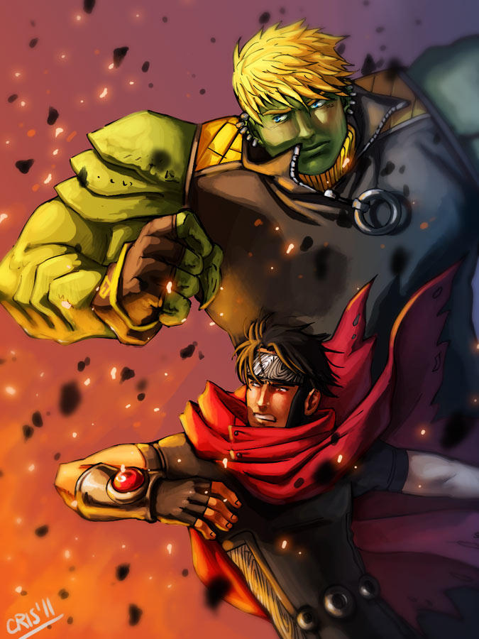 2boys alien black_hair blonde_hair cloak colored_skin cris_art debris embers forehead_protector frown green_scales green_skin hulkling light_particles male_focus marvel multiple_boys muscular muscular_male red_cloak serious short_hair sleeveless superhero_costume thick_eyebrows upper_body wiccan