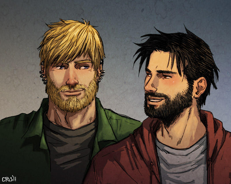2boys aged_up bara beard black_hair blonde_hair collared_shirt couple cris_art ear_piercing eye_contact facial_hair hood hooded_jacket hulkling jacket layered_shirt looking_at_another male_focus marvel mature_male multiple_boys mustache open_clothes open_jacket piercing shirt short_hair sideburns smile thick_eyebrows upper_body wiccan yaoi