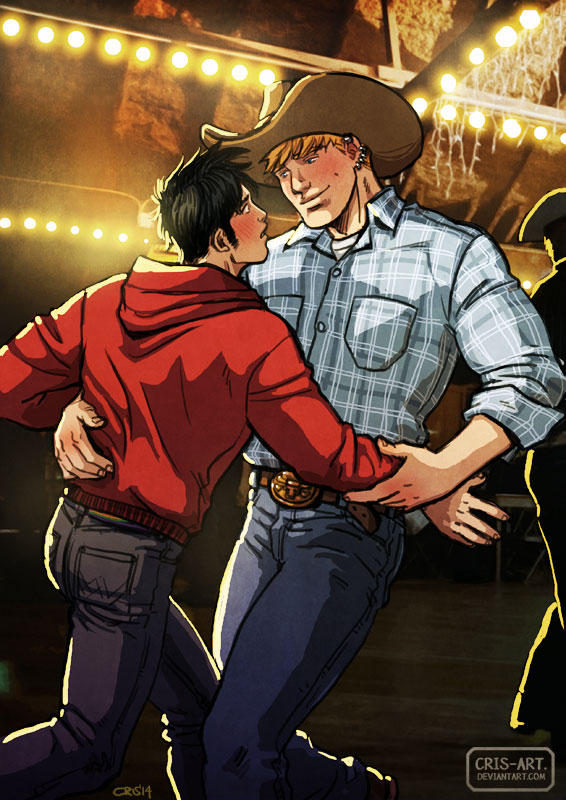 2boys alternate_costume alternate_universe bara black_hair blonde_hair blue_shirt collared_shirt couple cowboy_hat cowboy_western cris_art dancing denim eye_contact feet_out_of_frame hand_on_another's_back happy hat hood hoodie hulkling jeans layered_shirt leather_belt long_sideburns looking_at_another male_focus marvel multiple_boys pants red_hoodie shirt short_hair sideburns sleeves_rolled_up smile thick_eyebrows toned toned_male wiccan yaoi