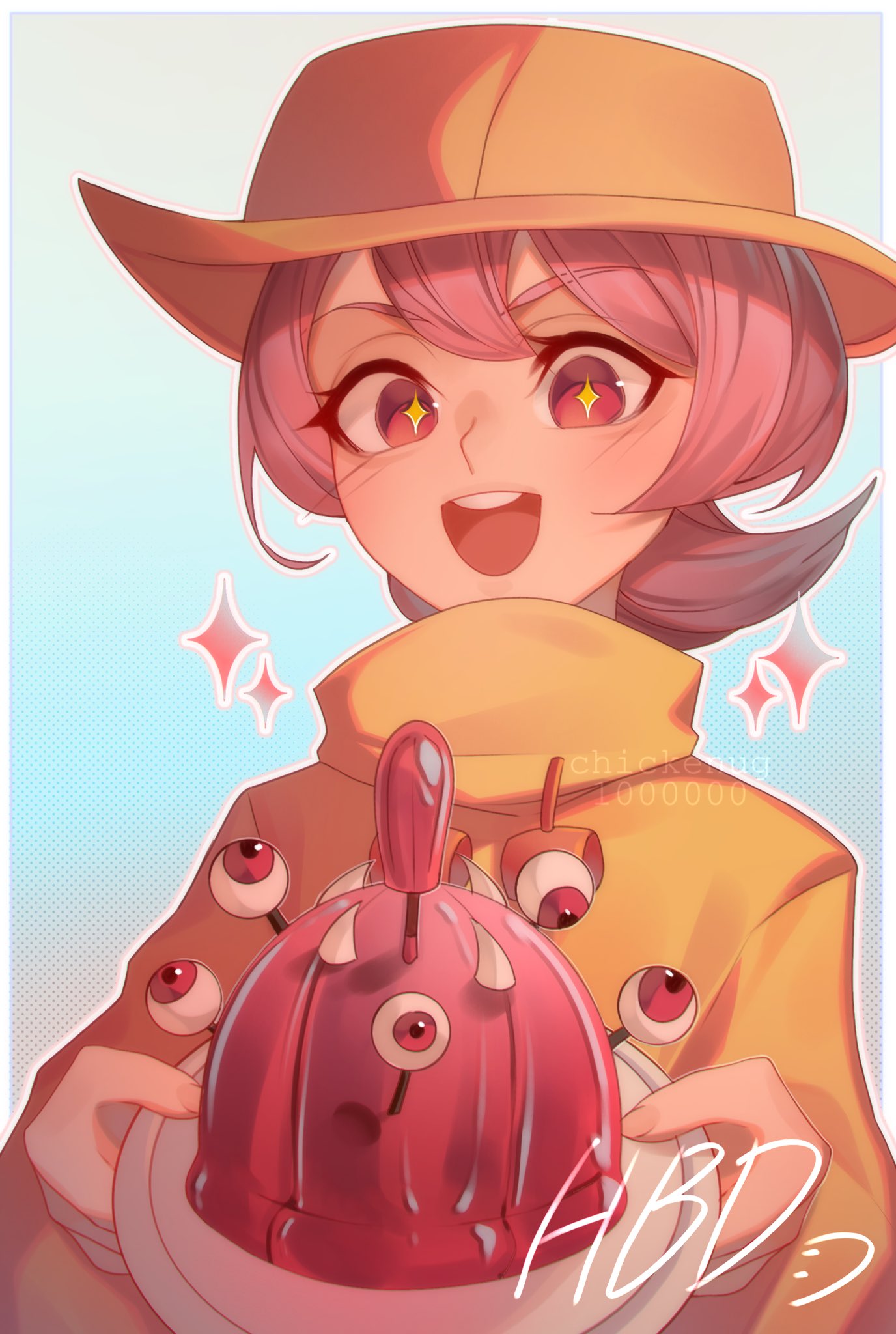 1girl blush chikenug1000000 food gelatin hat highres holding holding_plate looking_down open_mouth pink_eyes pink_hair plate raincoat short_hair skullgirls smile solo sparkle umbrella_(skullgirls) upper_body