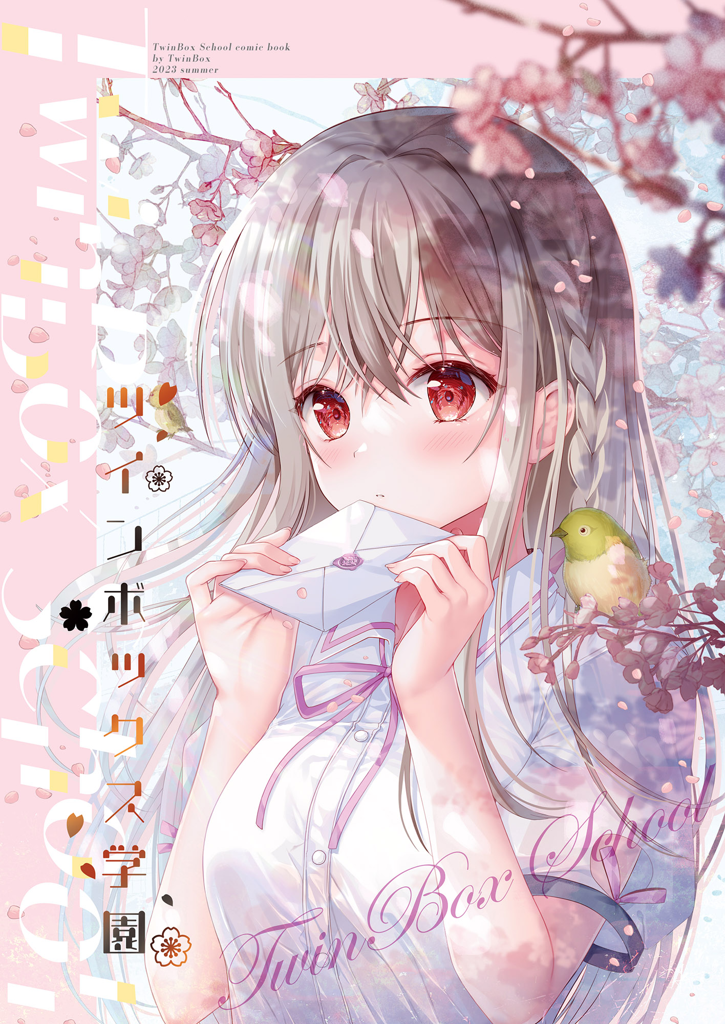 1girl bird blush braid branch breasts cherry_blossoms closed_mouth dot_nose envelope falling_petals hair_between_eyes highres holding holding_envelope light_brown_hair long_bangs long_hair looking_at_viewer maeda_shiori medium_breasts neck_ribbon petals pink_ribbon raised_eyebrows red_eyes ribbon school_uniform shirt short_sleeves solo sousouman straight_hair twinbox_school upper_body white_shirt