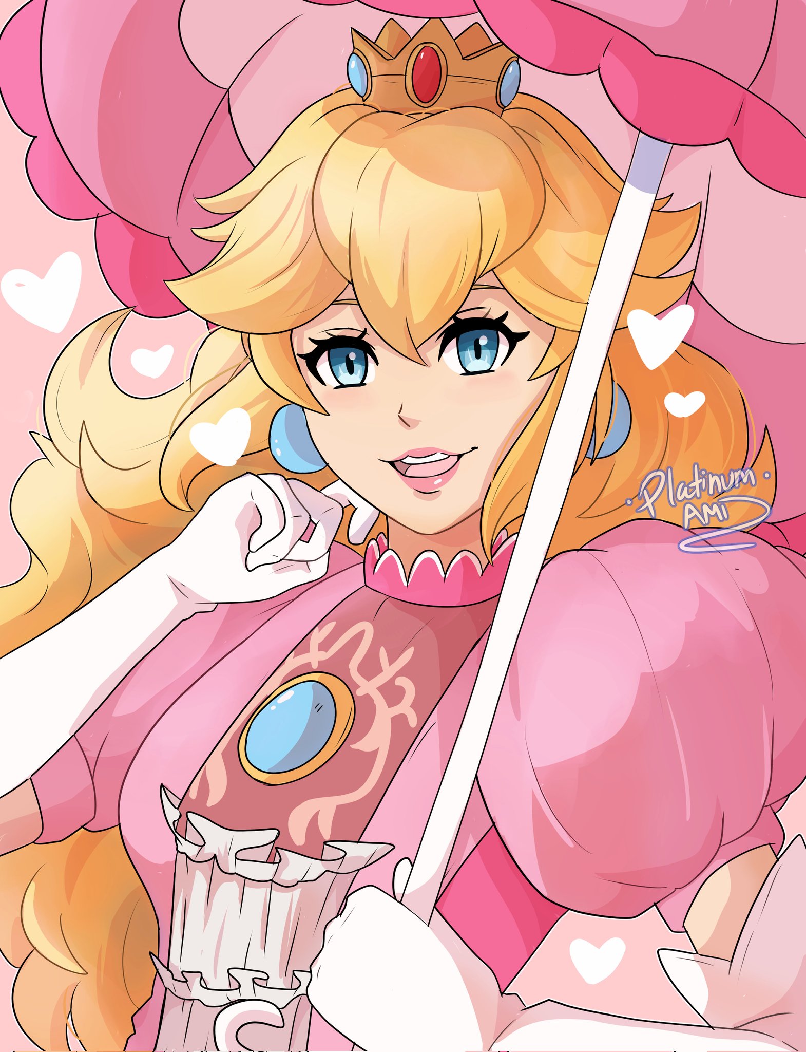 1girl blonde_hair blue_eyes breasts corrupted_twitter_file crown dress earrings gloves highres jewelry long_hair mario_(series) medium_breasts nintendo platinum_ami princess_peach sphere_earrings super_smash_bros. umbrella