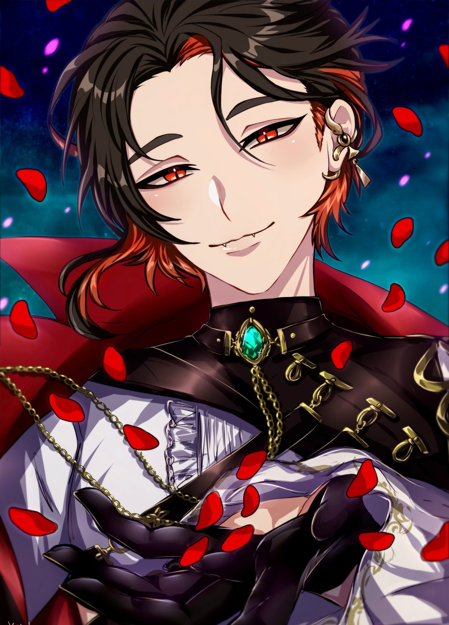 1boy asymmetrical_hair brown_hair cape chain earrings fangs fangs_out gloves gold_chain highres jewelry looking_at_viewer male_focus multicolored_hair nu_carnival petals red_cape red_eyes red_hair rose_petals short_gloves short_hair smile vampire wind yadome810 yakumo_(nu_carnival)