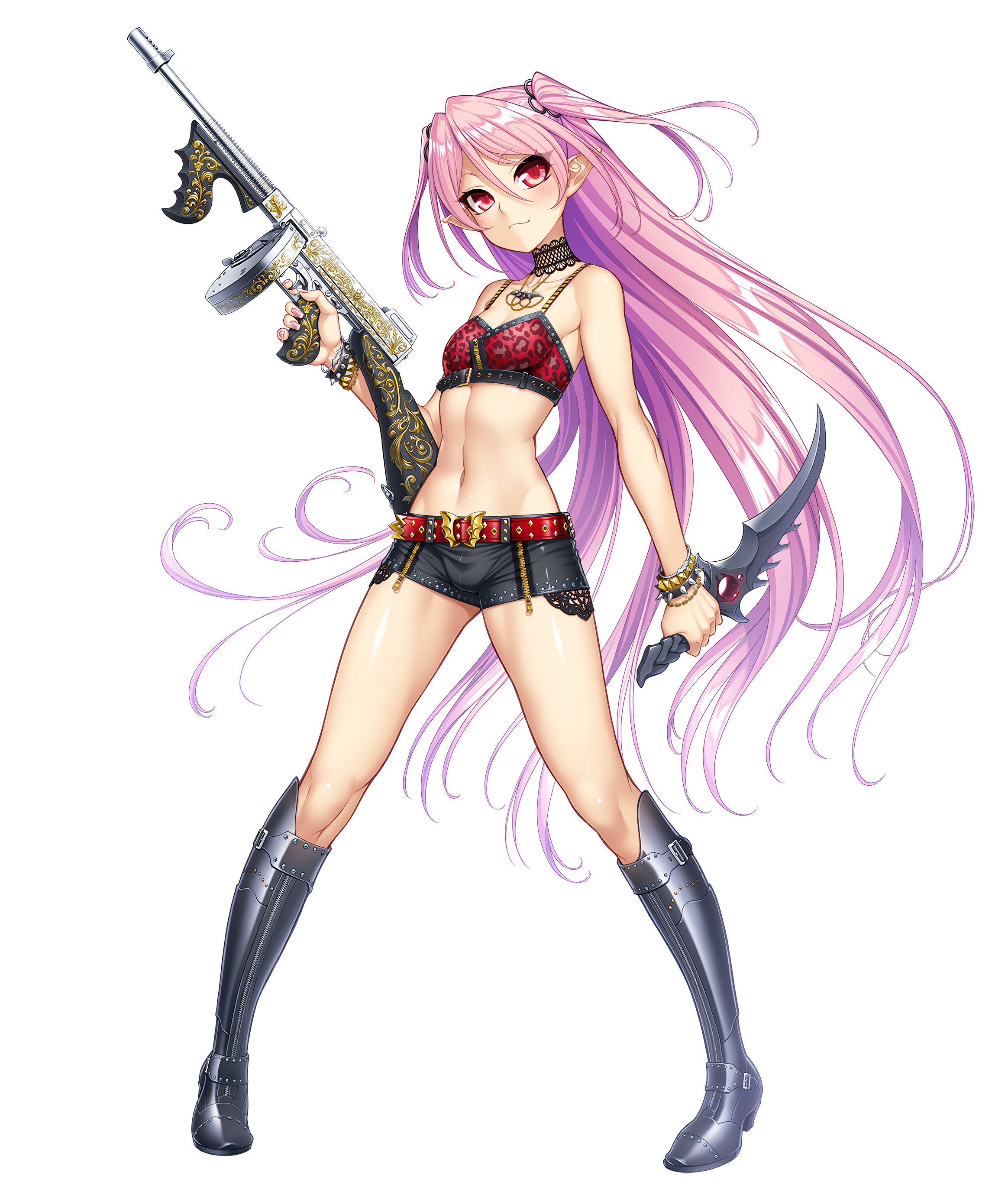 1girl :3 absurdres alternate_costume bare_legs bare_shoulders boots breasts cleavage collar collarbone demon_girl felicia_(taimanin_kurenai) female_focus fingernails full_body highres holding holding_knife holding_weapon knife lilith-soft long_hair looking_at_viewer micro_shorts navel official_alternate_costume official_art pantyhose pink_hair pointy_ears red_eyes shiny_skin short_shorts shorts small_breasts smile standing taimanin_(series) taimanin_kurenai taimanin_rpgx thighs two_side_up very_long_hair weapon white_background wide_hips zol
