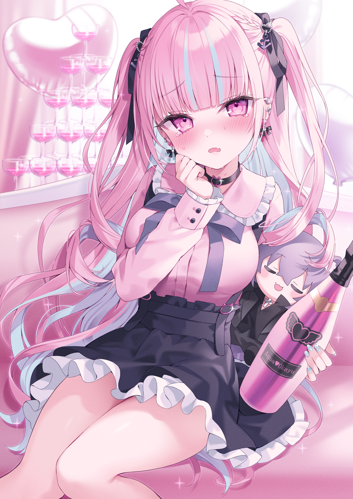 1girl ahoge alternate_costume anchor_ornament anchor_symbol balloon black_bow black_choker black_ribbon black_skirt blue_nails blunt_bangs blush bottle bow bow_earrings breasts cat_choker character_doll choker commentary cross cross_piercing cup curly_hair doll ear_piercing earrings fang fingernails frilled_skirt frills glint hair_ribbon hand_on_own_cheek hand_on_own_face heart heart_balloon heart_earrings heart_in_eye high-waist_skirt highres holding holding_bottle hololive jewelry jirai_kei large_breasts legs long_fingernails long_hair long_sleeves looking_at_viewer minato_aqua multicolored_hair nail_art nail_polish nekomata_okayu open_mouth piercing pink_eyes pink_hair pink_liquid pink_sailor_collar pink_shirt pink_theme purple_ribbon ribbon sailor_collar shirt shu_bii skin_fang skirt sleeves_past_wrists solo streaked_hair suspender_skirt suspenders symbol_in_eye tearing_up tears thighs two-tone_hair two_side_up very_long_hair virtual_youtuber